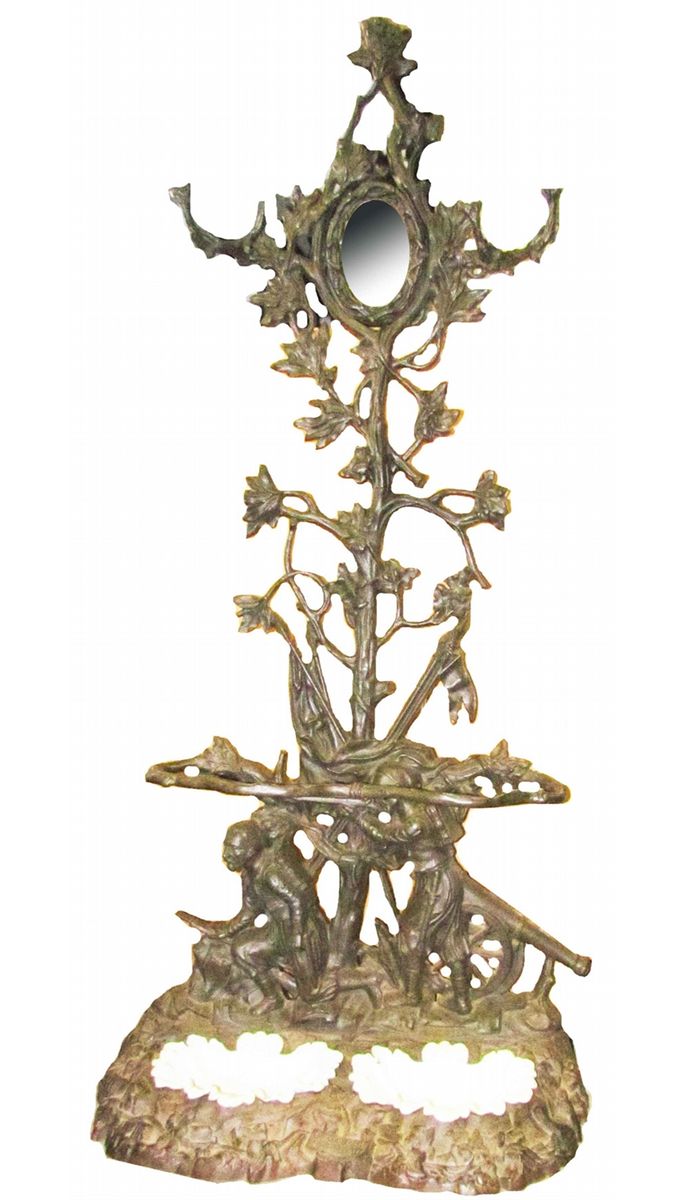 Mid-19th Century Elegant Cast Iron Hall Tree. Signed Corneau Frères, the brothers Corneau were blacksmiths who created a foundry in 1846 in Charleville-Mezieres, Northern France. Two Military Figures on base. White umbrella trays. Excellent original condition. 75 X 35 X 17 inches.
