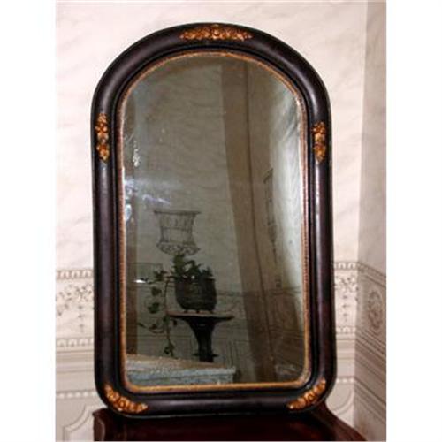 Mid 19th century Napoleon III mirror is a dark brown/black curved wood with deep gold gilt accents. The five carvings are very distinctive in detail and beautifully colored. Ornate gilt trim to match surrounds the arched top mirror which shows age with light streaks here and there but seemed to co-ordinate so well with the frame,we left. A new one can easily be cut if desired. Old wood back panels and nails with heavy string for hanging. Very masculine looking. Frame in super condition. Measures 37H X 23L X 1.25D.