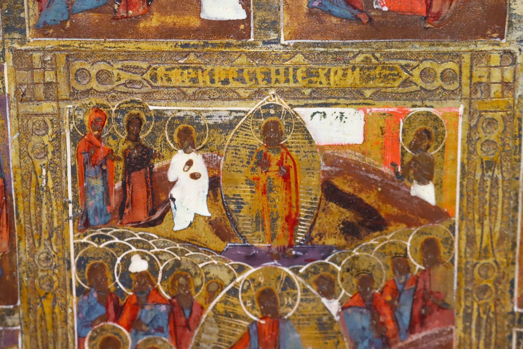 Antique Russian icon of the Resurrection of Christ containing several scenes, rich with history and elaborate religious symbolism. Russians sometimes speak of an icon as having been 'written' because in the Russian language, the same word means both to paint and to write. Painted with egg tempera in reds, ochres, and blues, on a gesso wooden panel.