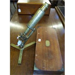 Mid 19th Century brass microscope on a folding triangular stand. Engraved 'Improved Compound Microscope by Carpenter and Westley, 111 New St. Birmingham' with accessories in a brass bound mahogany case