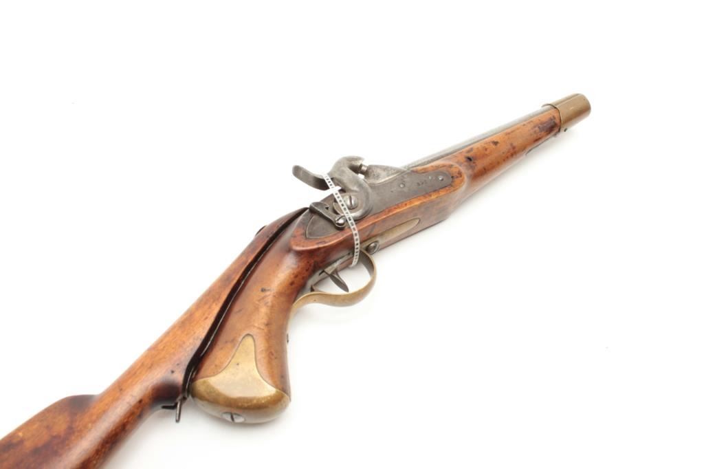 Mid-19th century Scandinavian military pistol with detachable shoulder sock probably Swedish. Measures 26” overall with a 10” barrel of approximately .62 caliber smoothbore. Detachable shoulder stock #395 on the lock and #341 on the butt cap. The stock is original to the period and shows plaque with initials or numbers. In very good plus condition overall and meant to be issued to heavy cavalry or dragoons. (Antique) Est.:$1400-2800