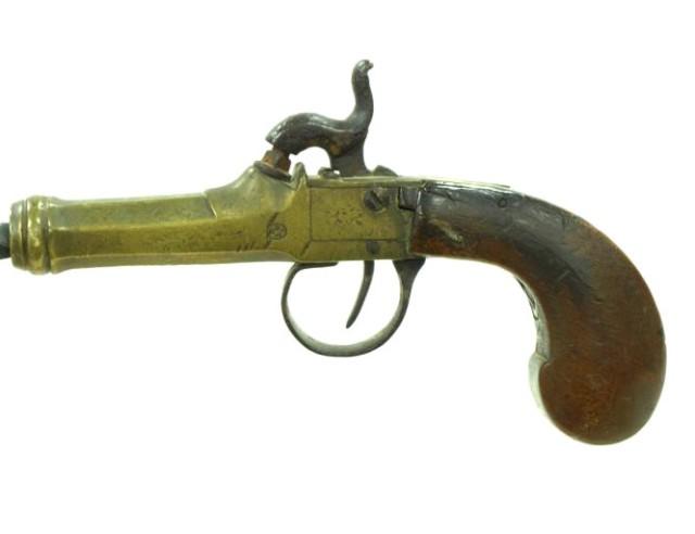 with brass octagon barrel and walnut birds head grip. LEG proof to left side and in operating condition. Measures 6" overall, No FFL required.