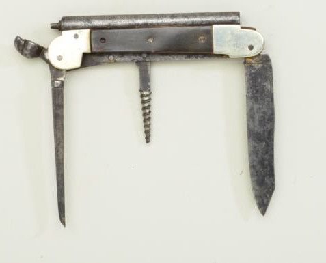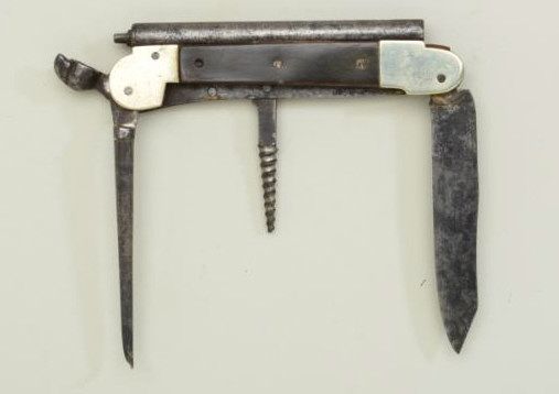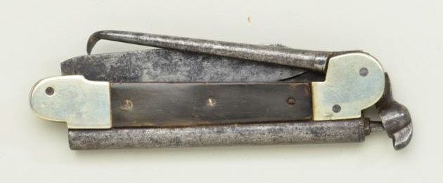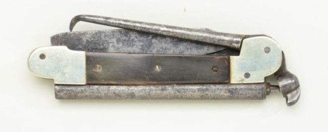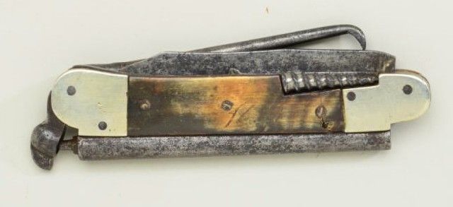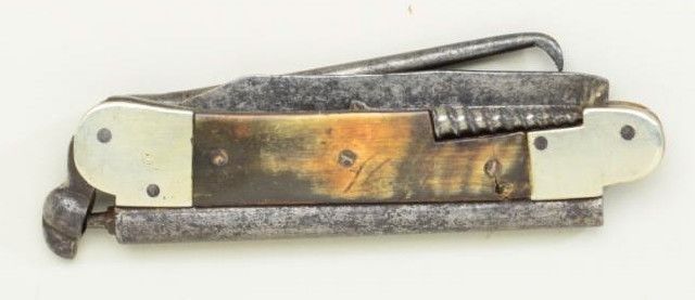 Mid 19th century percussion knife pistol with corkscrew trigger, folding knife blade, sailor spike (awl), and horn grip scales with German silver ends. The weapon measures 5 1/16” in length of body. The barrel portionmeasures 4 ¼” and is approximately .32 caliber. The knife blade measures 3 ¾”. The metal surfaces show a deep patina and light slightly heavy scattered pitting. The grip scales are good with some warping and one (1) crack by screw. The action is not working. Similar example pictures page 70 “Blades & Barrels by Gordon Frost”. From an old N.Y. Collector’s Estate. Est.; $600-$1,200