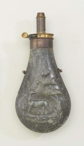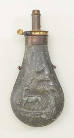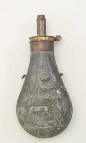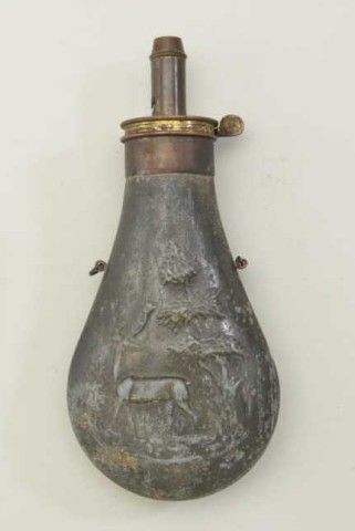 Mid 19th century pewter body shotgun flask showing embossed decoration of stag in forest. The flask measures 7-1/2" from tip to end, shows a 3 stage charger and 2 rings. The spring is broken, otherwise good. Est.:$35-$70.