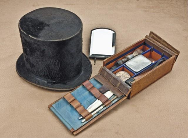 Mid-19th century portable shaving set in leather case, showing beveled edge folding mirror, ivory handled razor, brush and other implements. Good condition. The type carried by a Civil War Officer. Good overall condition. Beaver felt top hat marked J. Latimer, Utica, New York. Approx. 6-1/2” in height, good condition, some wear at the edges, generally good overall. Sweat band intact, some normal fraying. Dates approx. 1850. A remnant of America’s fur trade. Est: $300 - $600