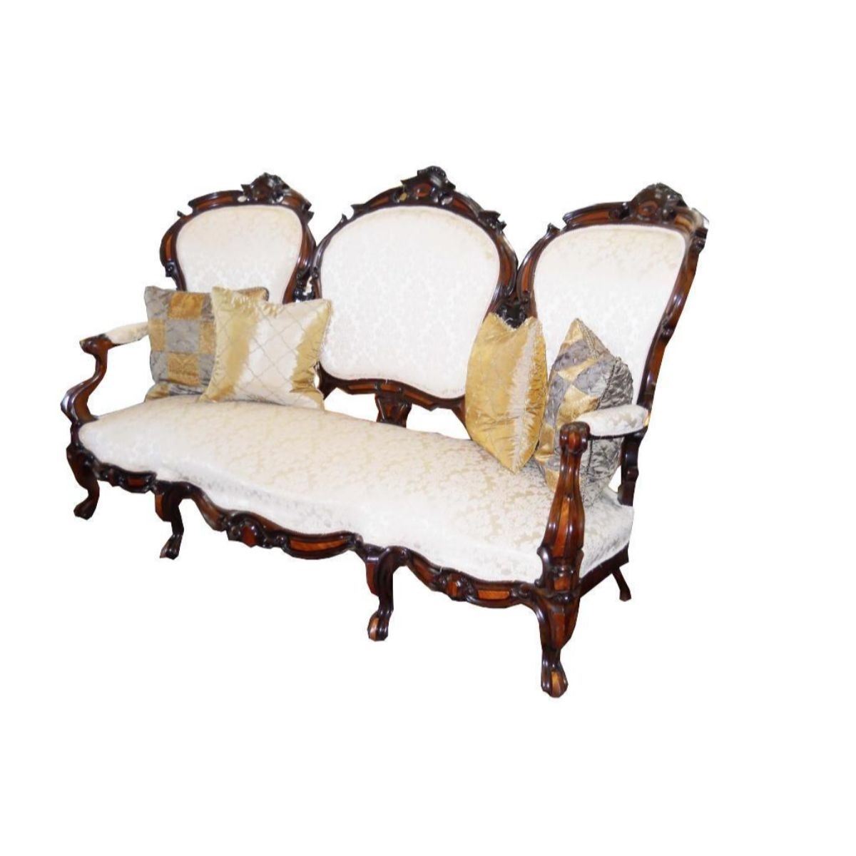 Mid 19thc American walnut & rosewood settee. Victorian baroque revival. Triple back panel, elegantly carved, baroque ivory cotton upholstery, all in like-new condition. DDirect from an 1858 plantation home in South Carolina.