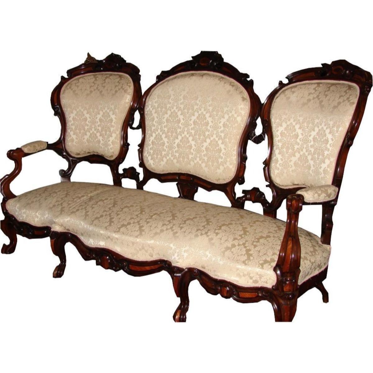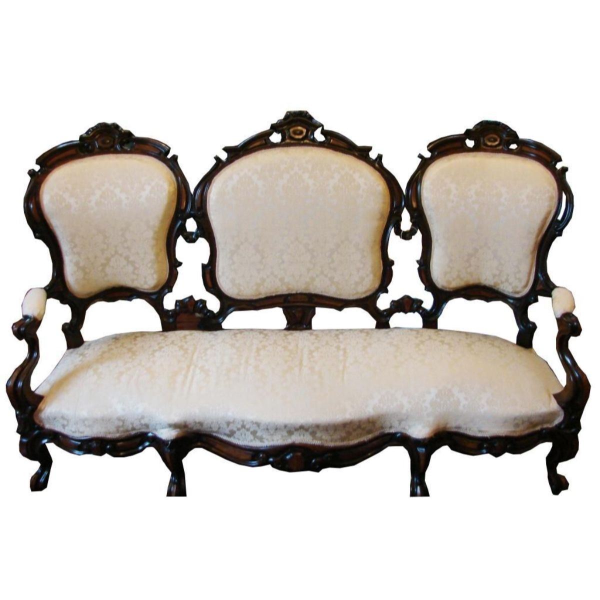 Mid 19thc American walnut & rosewood settee. Victorian baroque revival. Triple back panel, elegantly carved, baroque ivory cotton newer upholstery. Provenance:from an 1858 plantation home in South Carolina. * special shipping arrangements are required due to size & weight.