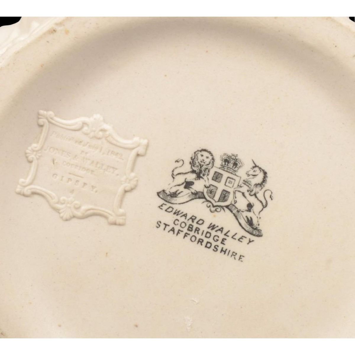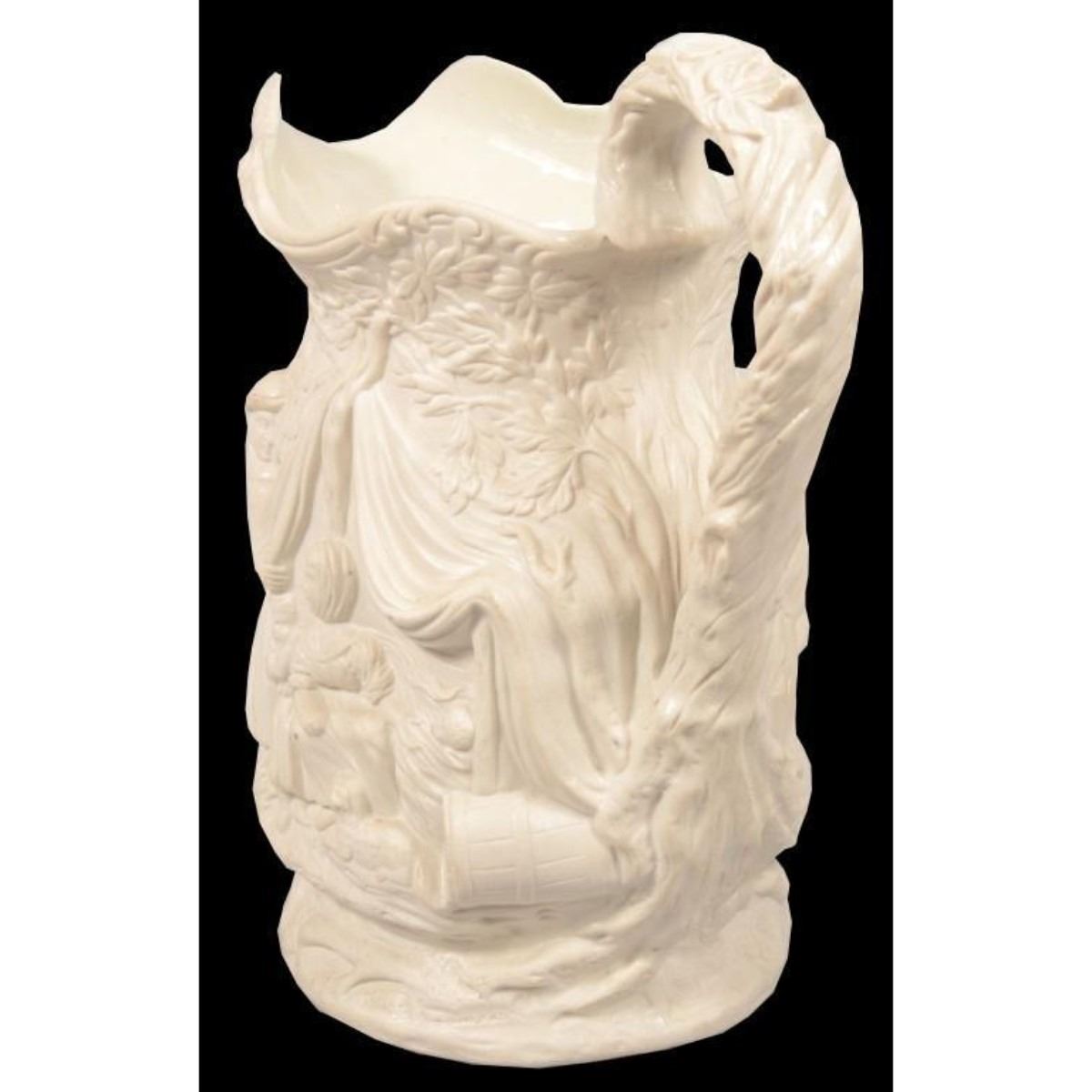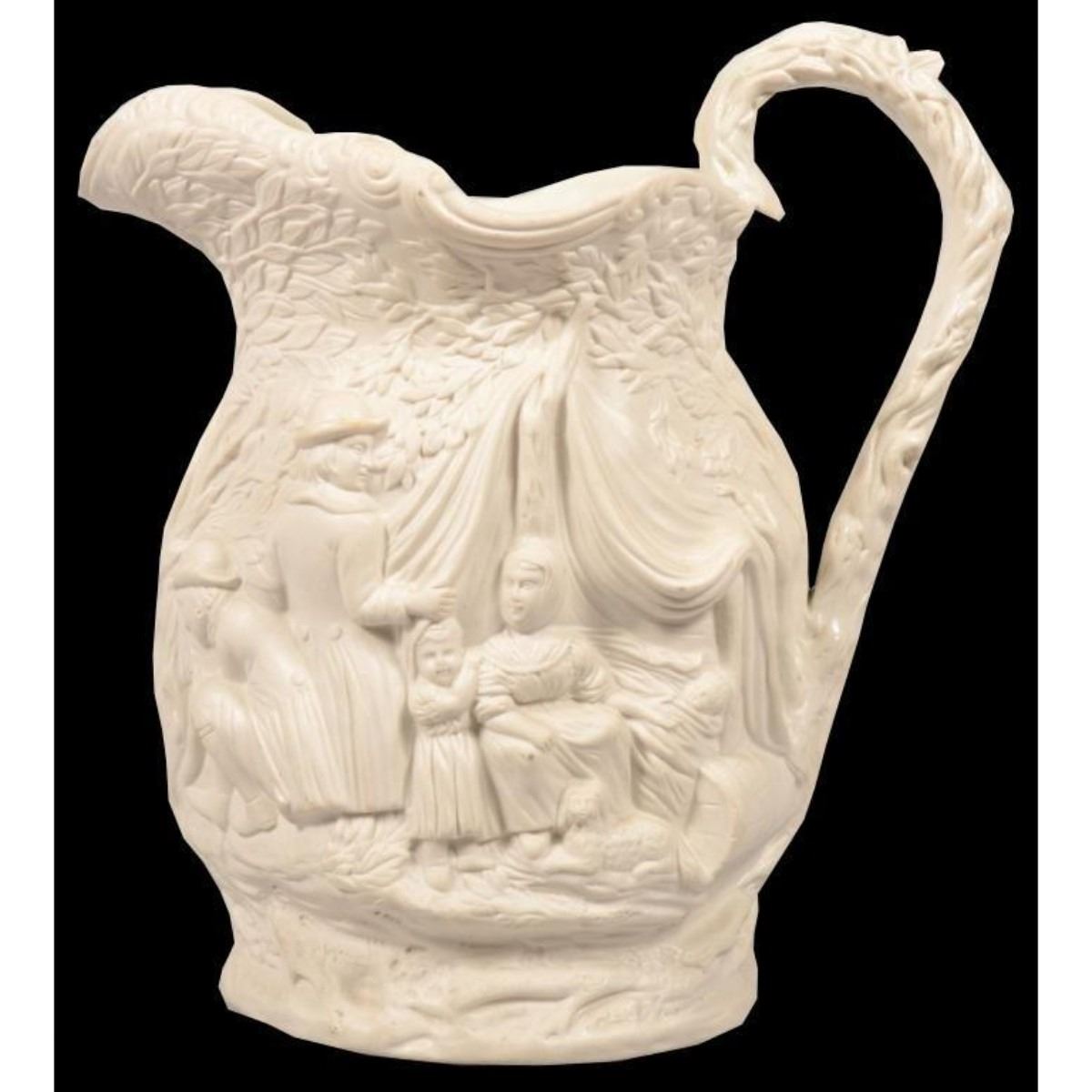 Mid 19th century, English, white parian ware, Gypsy pattern pitcher. This molded earthenware jug with high relief design shows a group of gypsies camping in the woods with a tent on one side and a cook fire on the