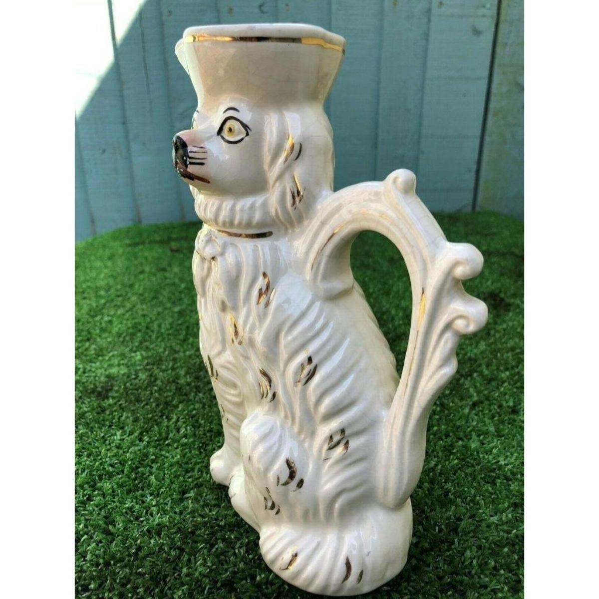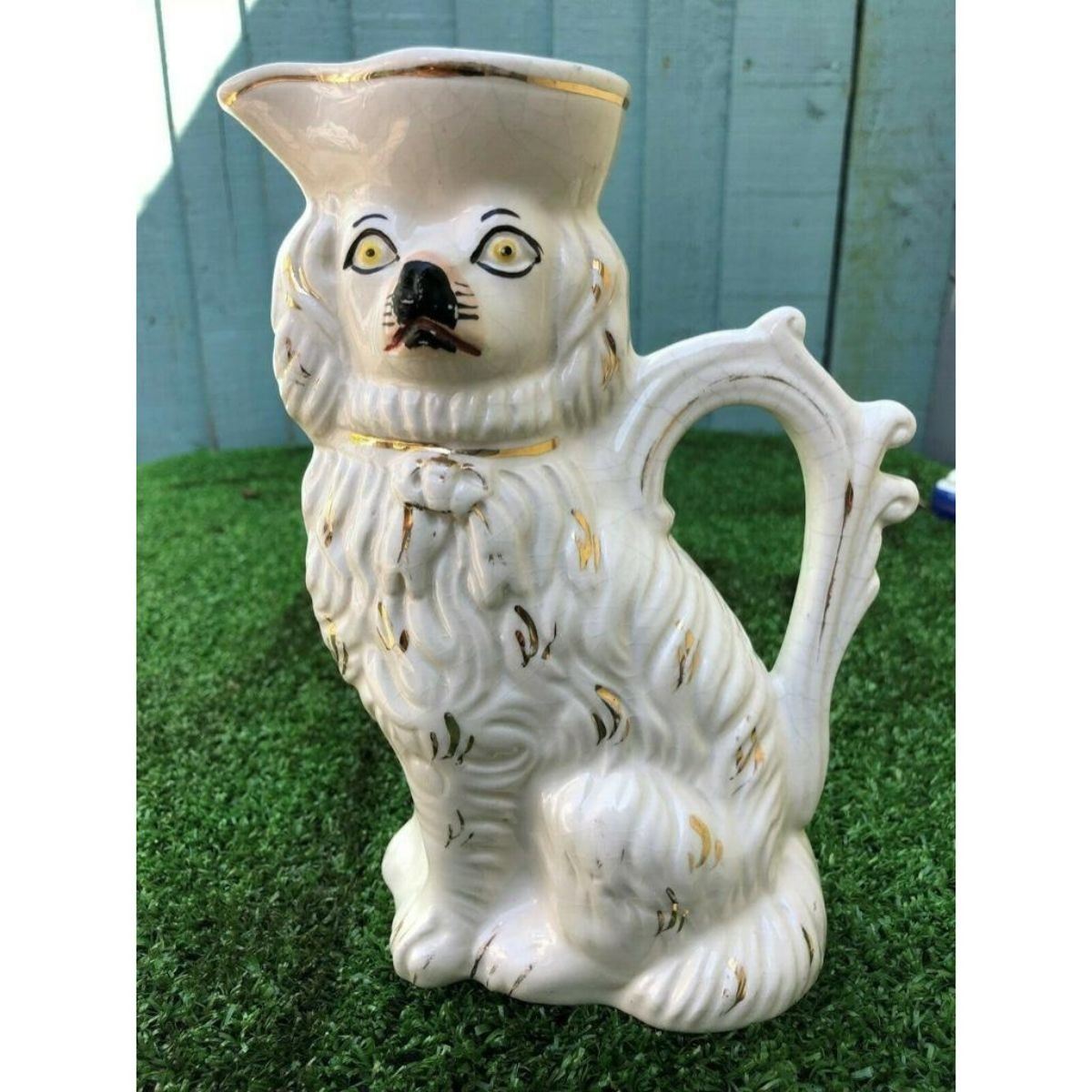 Mid 19th Century ( c1850 ) English Staffordshire porcelain pitcher, jug, in the form of a spaniel dog with decorative handle. An original & wonderful portrayal featured in the A - Z of Staffordshire Dogs by Clive Mason Pope. Excellant condition considering age.  7 3/4" H. 4 1/2" X 2 3/4" base. Â