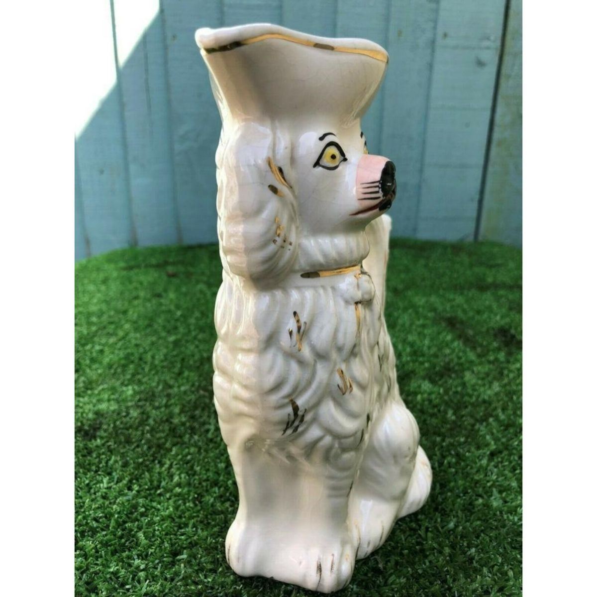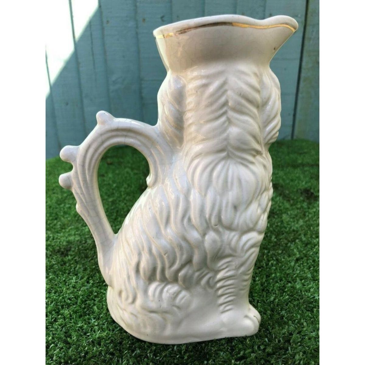 Mid 19th Century ( c1850 ) English Staffordshire porcelain pitcher, jug, in the form of a spaniel dog with a decorative handle. An original & wonderful portrayal featured in the A - Z of Staffordshire Dogs by Clive Mason Pope. Excellent condition considering age.  7 3/4" H. 4 1/2" X 2 3/4" base. Â