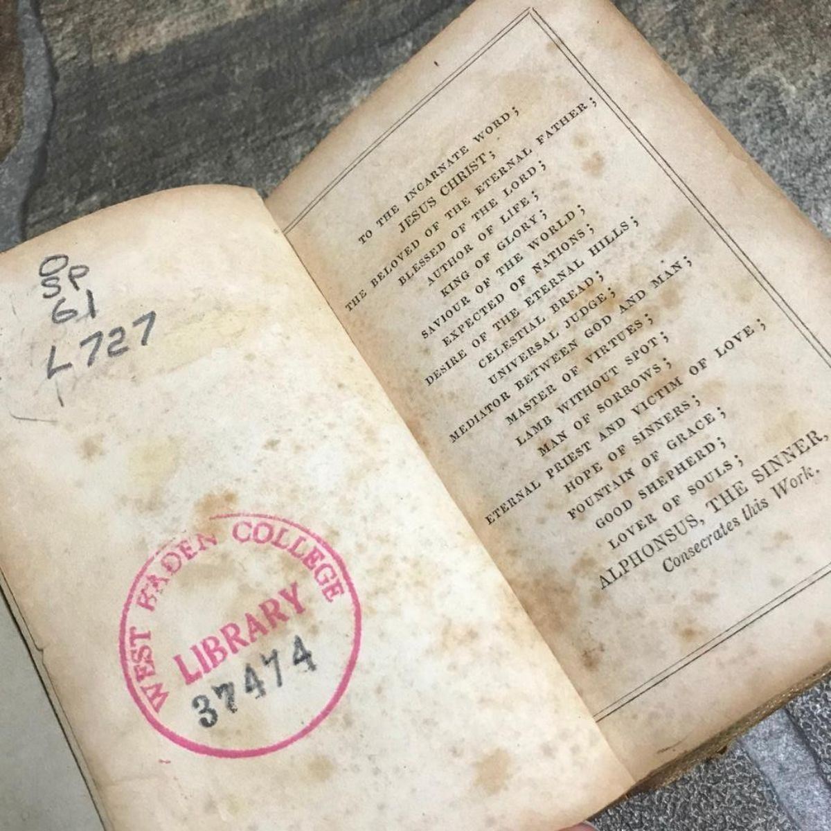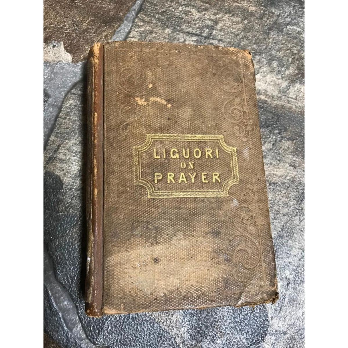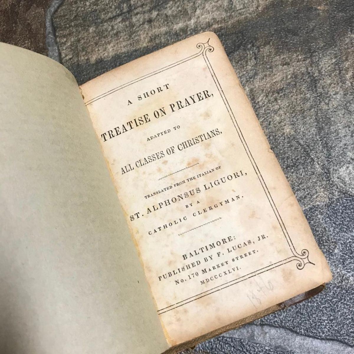Prayer Book dated 1846, "A Short Treatise On Prayer adapted to All Classes of Christians" translated from the Italian of St. Alphonsus Liguori, by a Catholic Clergyman. Baltimore: published by F. Lucas, Jr. No 170. Market Street. 208 pages. Ex-library book with partial check out card affixed to inside back cover page & West Baden College library stamp on inside cover page, as well as library #'s written in permanent ink on outside spine. 3 1/4" X 5". * some damage to page edges on pages 115 - 128.