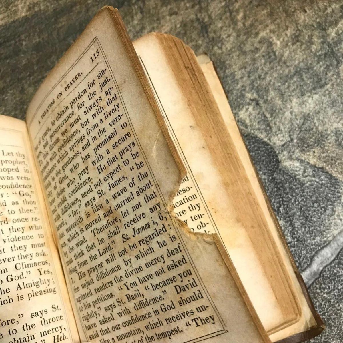 Prayer Book dated 1846, "A Short Treatise On Prayer adapted to All Classes of Christians" translated from the Italian of St. Alphonsus Liguori, by a Catholic Clergyman. Baltimore: published by F. Lucas, Jr. No 170. Market Street. 208 pages. Ex-library book with partial check out card affixed to inside back cover page & West Baden College library stamp on inside cover page, as well as library #'s written in permanent ink on outside spine. 3 1/4" X 5". * some damage to page edges on pages 115 - 128.