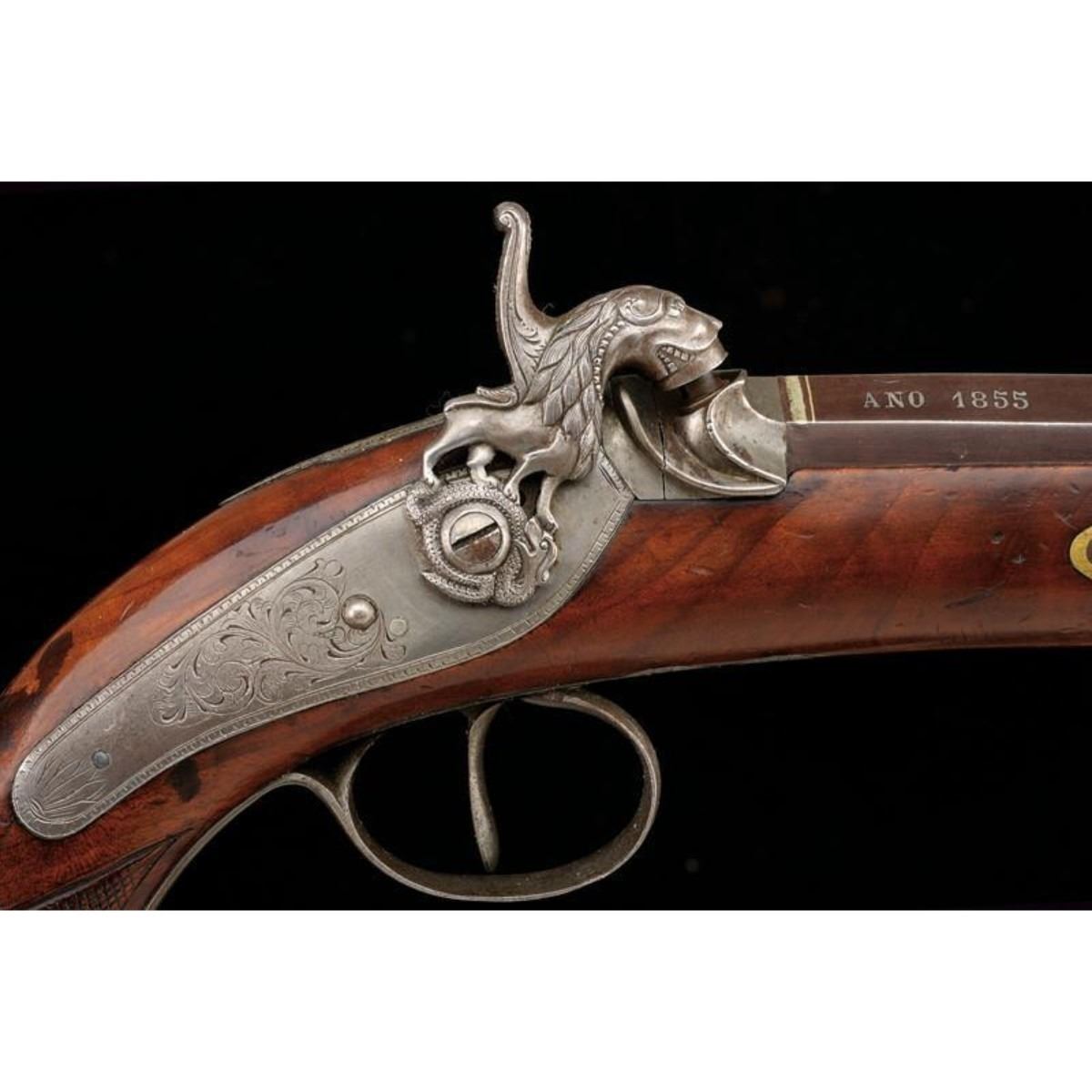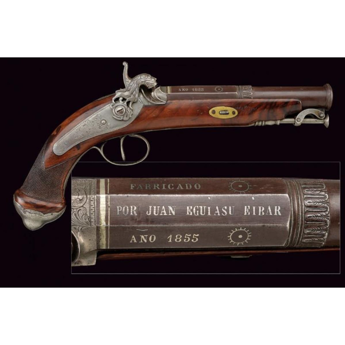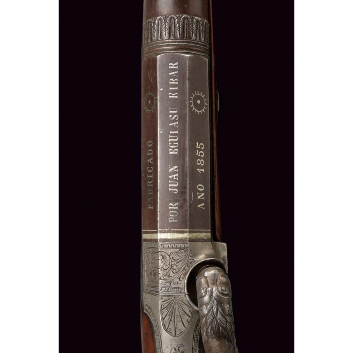Smooth barrel with two orders; the first octagonal part marked "FABRICADO POR JUAN EGUASI EIBAR ANO 1855" in silver, the second round part with acanthus leaves at the exchange. 17cal. The hammer in the form of a dog depicting a lion resting on a snake. Whole wooden case with iron fittings decorated in the same way, knurled neck. Iron rod with joint. Eibar, Spain. 12"L. ( 31 cm ). 10125-040518-CZ-00740