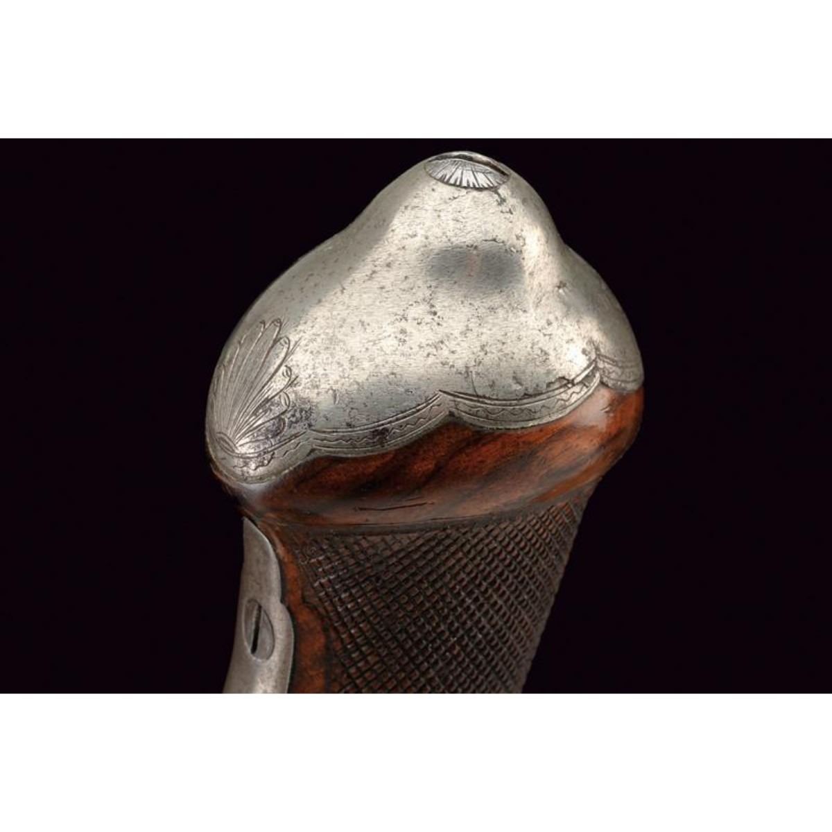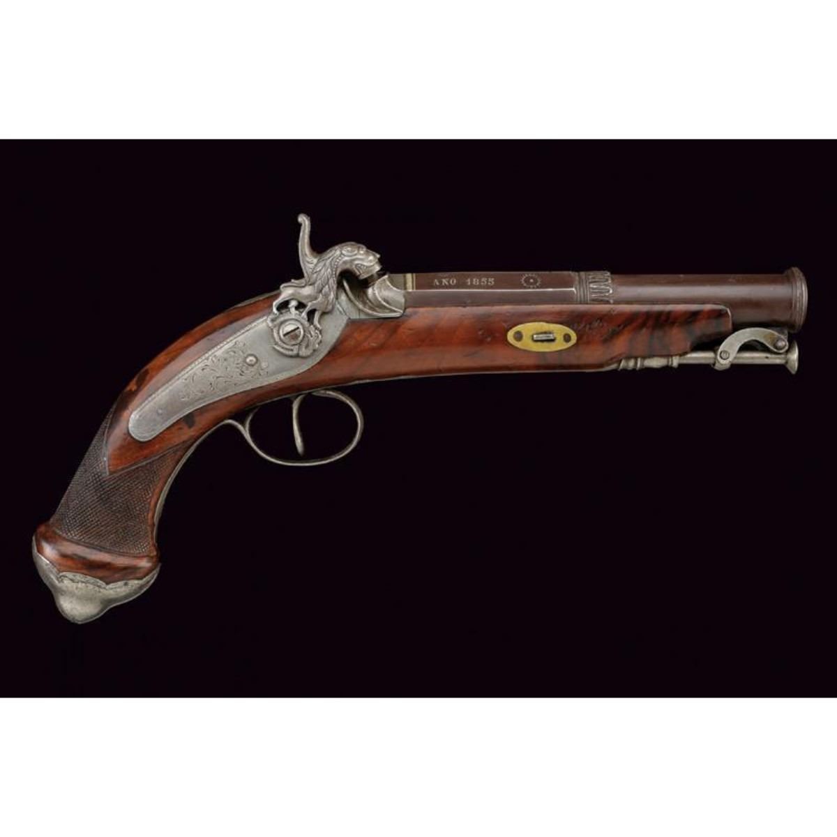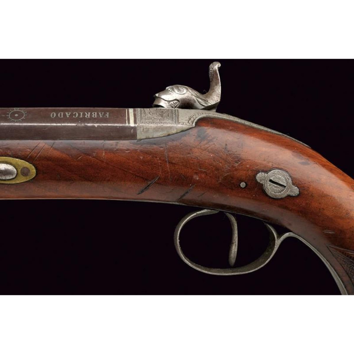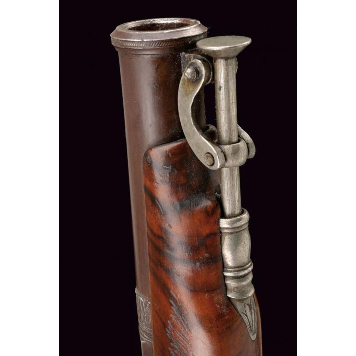 Smooth barrel with two orders; the first octagonal part marked "FABRICADO POR JUAN EGUASI EIBAR ANO 1855" in silver, the second round part with acanthus leaves at the exchange. 17cal. The hammer in the form of a dog depicting a lion resting on a snake. Whole wooden case with iron fittings decorated in the same way, knurled neck. Iron rod with joint. Eibar, Spain. 12"L. ( 31 cm ). 10125-040518-CZ-00740