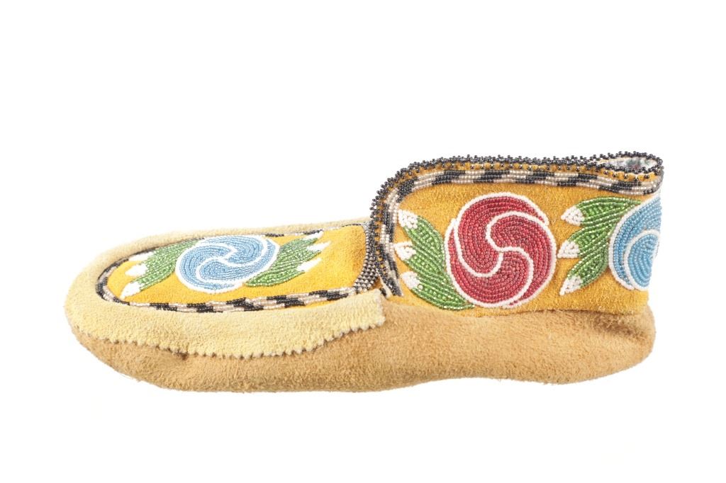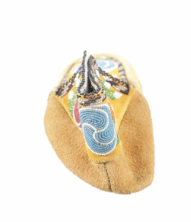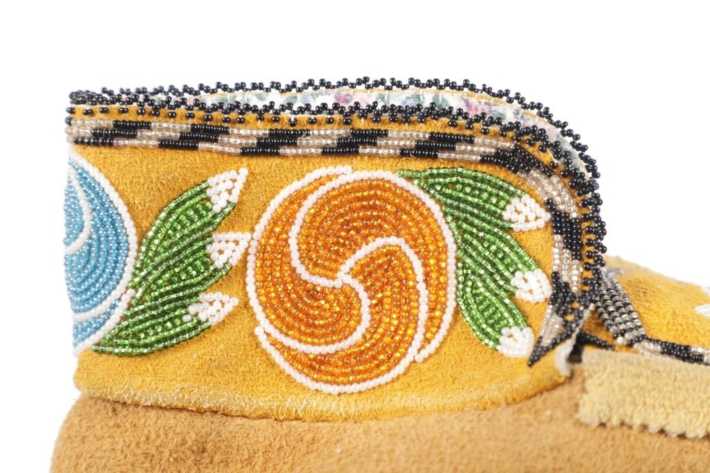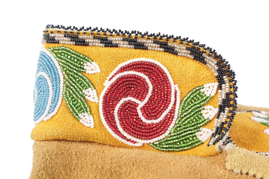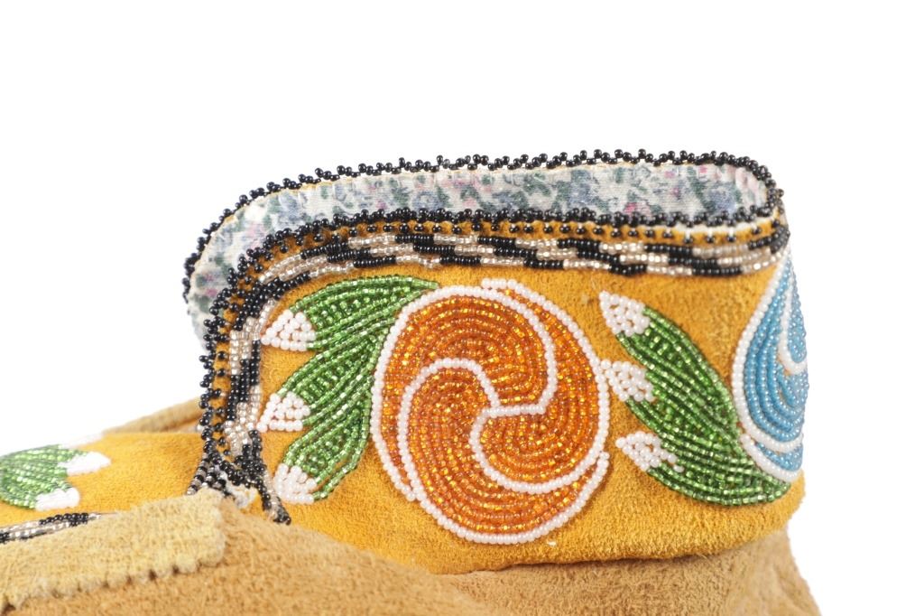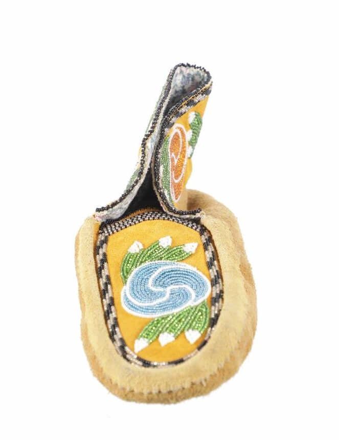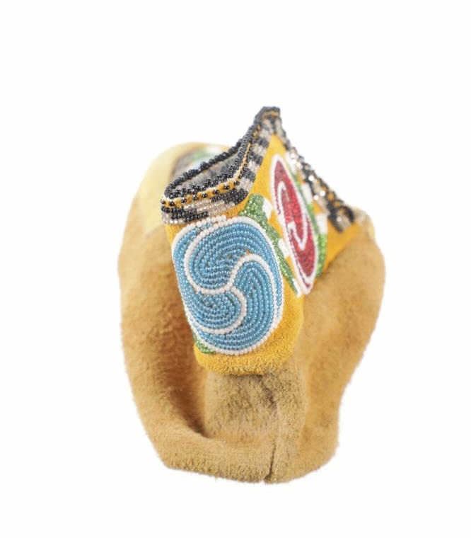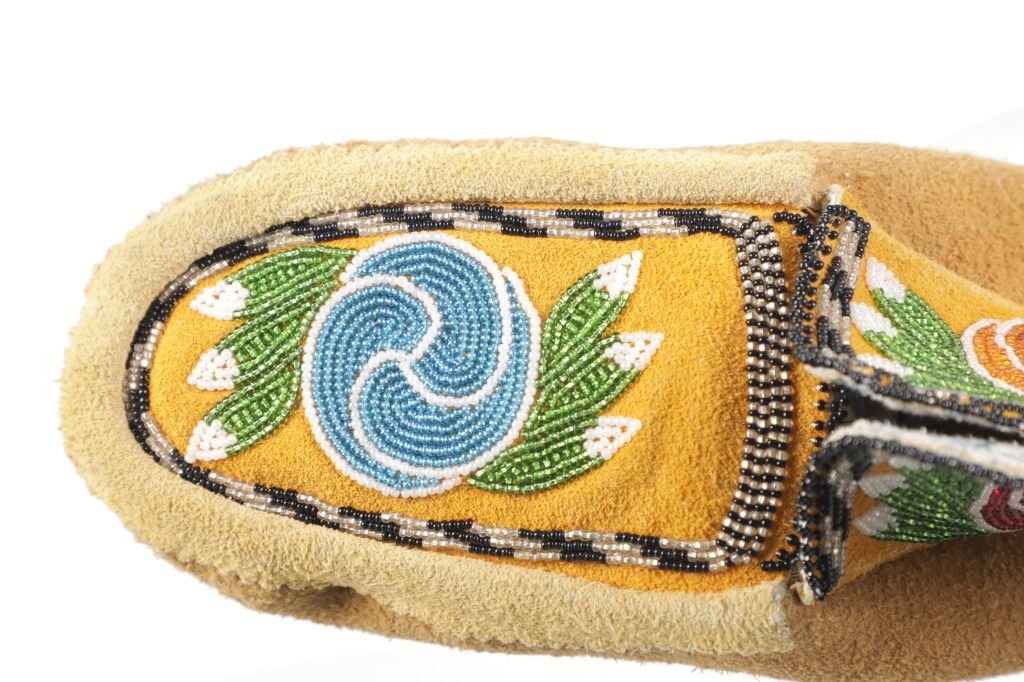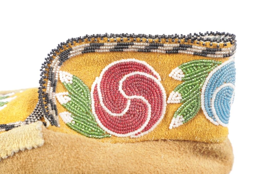 Featured in this lot is this mid 20th century First Nations hide beaded men's moccasins. The moccasins feature a wonderfully and professionally crafted hide and hide reinforced with beaded construction. The moccasins feature floral decoration with trade seed beads that consist of translucent blue, translucent white, translucent green, black and translucent red beads. The moccasins show a reinforced rim of the toe and shows a soft sole to the moccasins. The condition of this pair of First Nation moccasins is good with on slight wear spot to the bottom of the moccasins but otherwise shows good overall condition. The measurements of this pair of moccasins is 4 5/8" x 11" x 4 3/8". The collective weight of this pair of moccasins is 14oz.