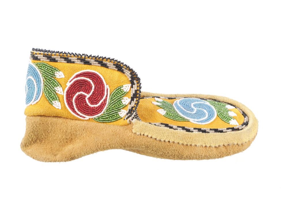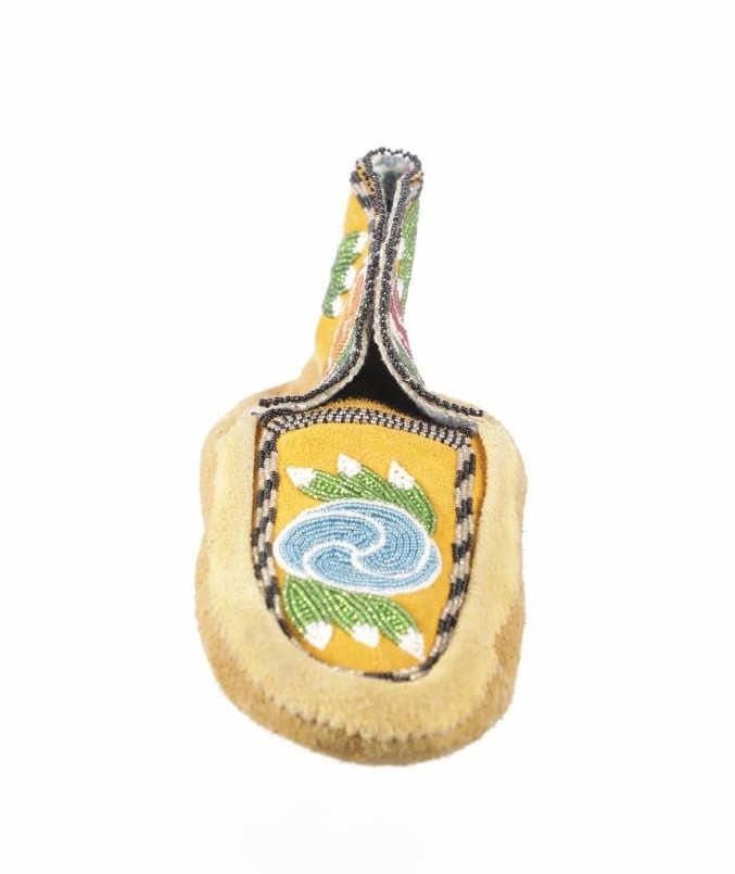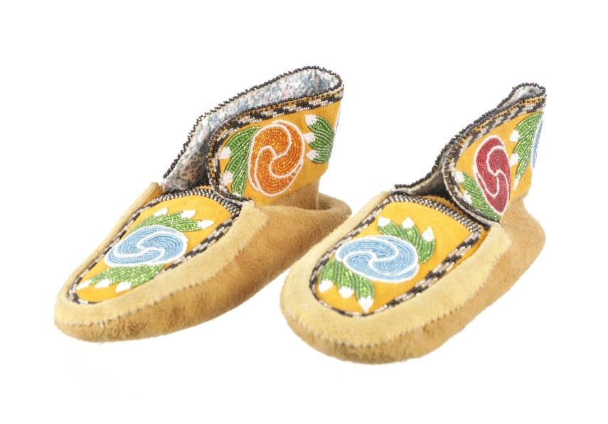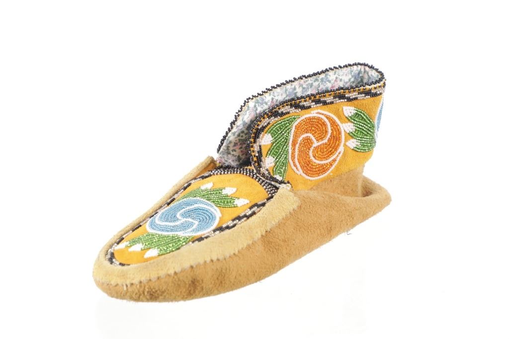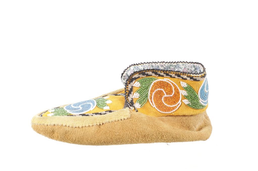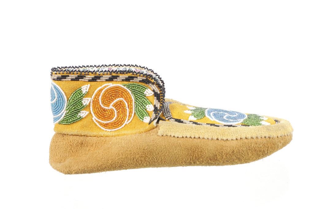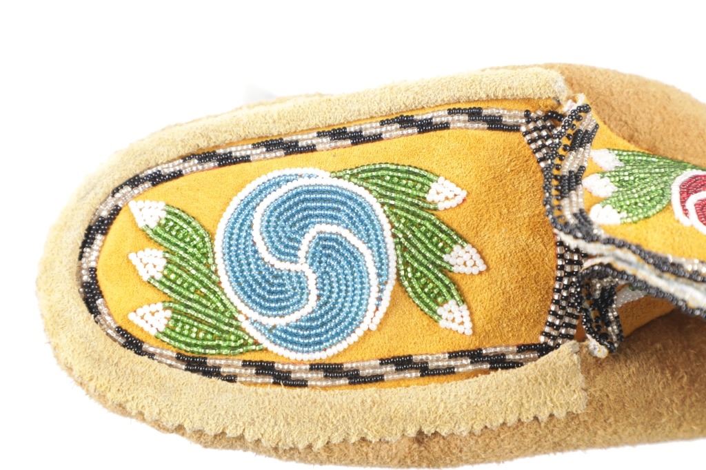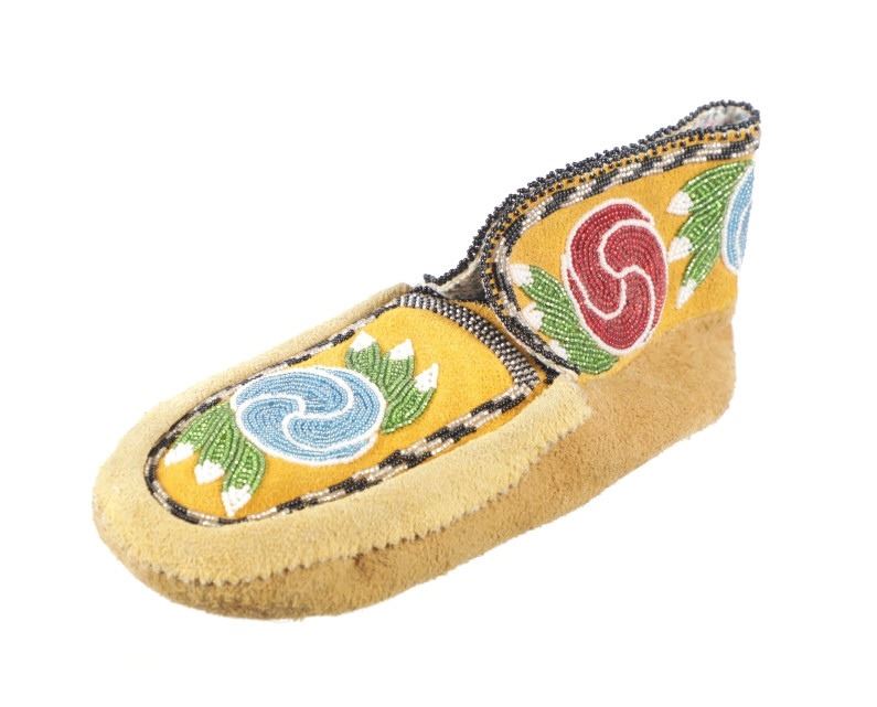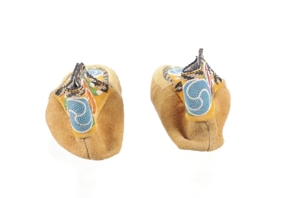 Featured in this lot is this mid 20th century First Nations hide beaded men's moccasins. The moccasins feature a wonderfully and professionally crafted hide and hide reinforced with beaded construction. The moccasins feature floral decoration with trade seed beads that consist of translucent blue, translucent white, translucent green, black and translucent red beads. The moccasins show a reinforced rim of the toe and shows a soft sole to the moccasins. The condition of this pair of First Nation moccasins is good with on slight wear spot to the bottom of the moccasins but otherwise shows good overall condition. The measurements of this pair of moccasins is 4 5/8" x 11" x 4 3/8". The collective weight of this pair of moccasins is 14oz.