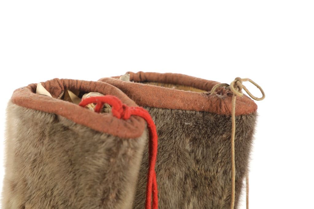 This is a fantastic circa 1950-1970’s vintage pair of men’s Alaskan Inuit Eskimo Mukluks done in sealskin, caribou and hide. Mukluks are a soft, supple knee-high boots traditionally made of sealskin, caribou, or reindeer skin and originally worn by the Native people of the Arctic, including the Inuit, Aleut, and Yupik tribes. The name Mukluk is derived from the Yupik word 'maklak', meaning "bearded seal", in reference to the bearded seal skin used to make the soles of the boots. This pair shows the traditional parfleche rawhide hard bases in Caribou with Seal fur high top having Indian tanned hide wrapping ties and trade clothe top with hide and lace ties. A nice men’s set that is well kept, stiff hides, some very slight loss and a few repairs, but overall good. Dan Paynich Great Falls, Montana collection. Each measures about 10.5”L sole by 14.5”H ankle by 4.5”W. Total weight of 1 lbs. 14 oz.