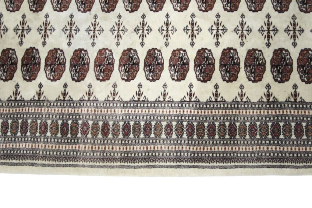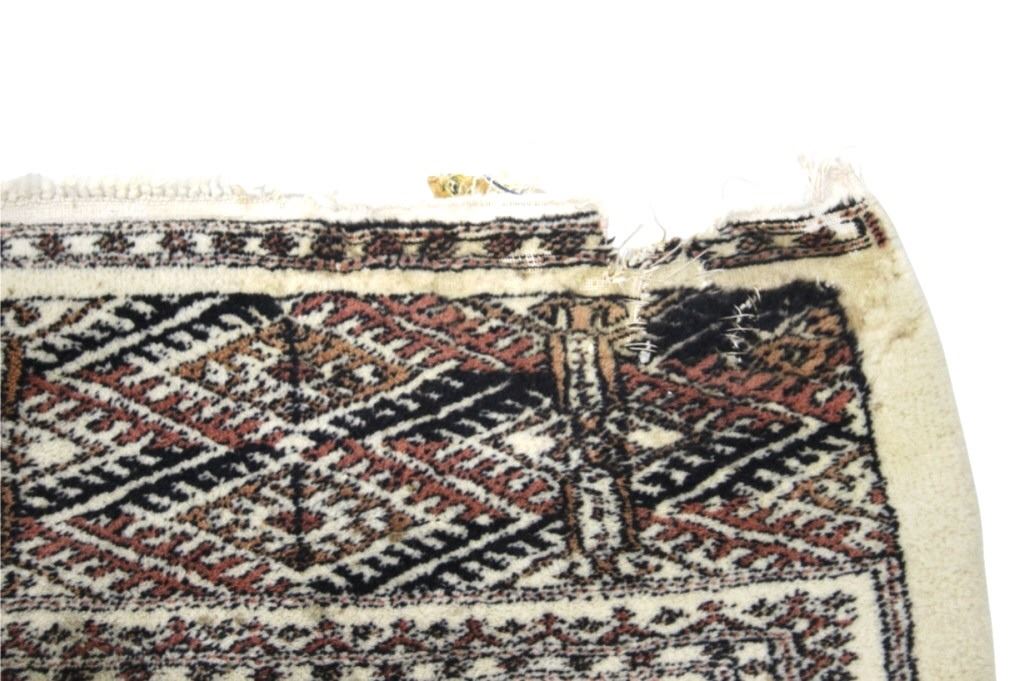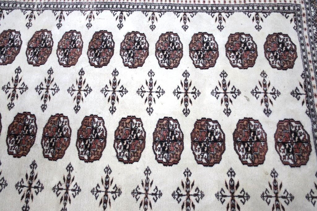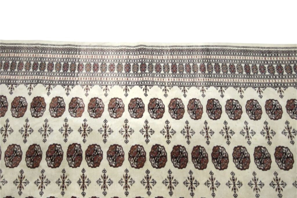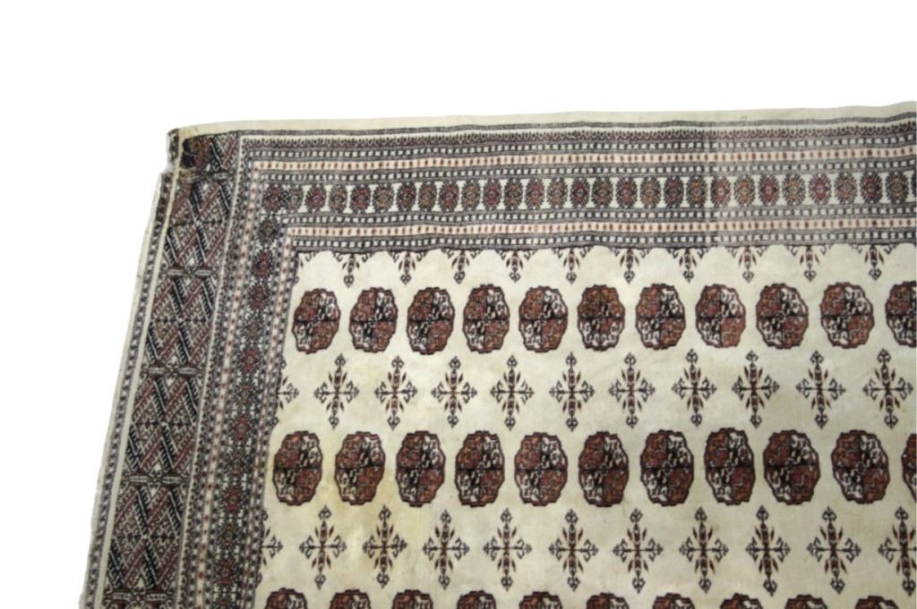 Featured in this lot is this large Tunisian Zerhivas / Zarbeeya Wool Rug, circa mid-20th century. Pile rugs known as "zerhivas" or "zarbeeyas", consist of a central motif bordered by an arabesque pattern. Most of these rugs follow traditional designs and motifs and are much longer to weave. They are found throughout Tunisia but are most common in Kairouan, Tunisia. Kairouan has been known for its silk, cotton and linen fabrics since the 8th century. Pile carpets in Kairouan are decendents of Anatolian imports in the 17th and 18th centuries, and such rugs were first made in Kairouan in the 18th century. From the 17th century, Tripolitanian Berbers migrated to Tunisia, bringing with them more complex and fine geometries. The “mergoum” technique was adapted to Kairouan carpets. The rug utilizes colours of brown, red, and black against a cream coloured background. Geometric designs are featured on the borders. A beautiful rug with fringe on each long end, nice condition and shows little wear and use. The rug measures 114" wide by 150.5" long.