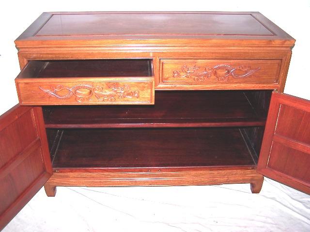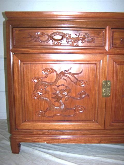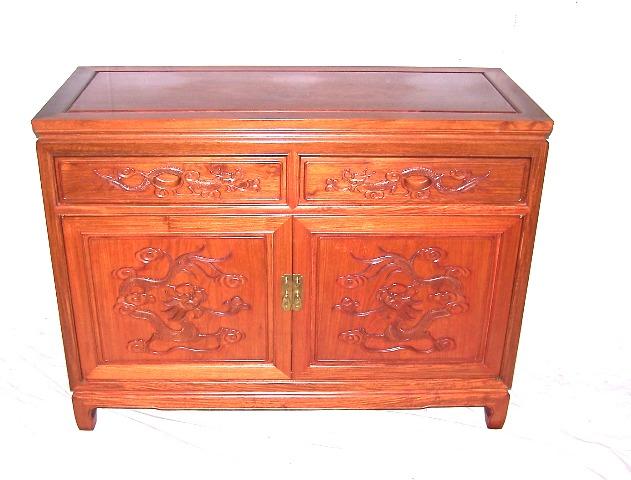 Carved oriental server with much detail of Oriental design to doors and drawers. Carved of red Asian mahogany. Apprx 46" x 34" x 20".