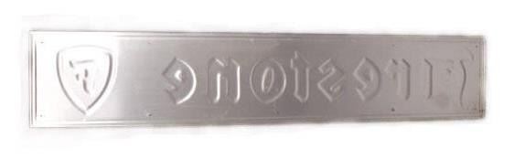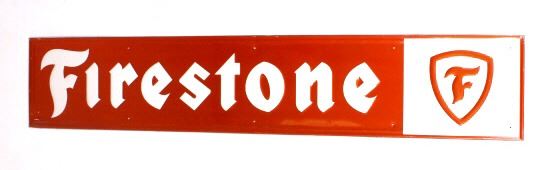 Featured in this lot we have a original Firestone tires advertising sign originating from the mid 20th century. The sign is embossed tin and reads "Firestone" in stylized lettering with the shield logo. The sign is marked at the bottom "Grace-Brite By Grace Sign & MFG. CO. St. Louis. MO. 32". The sign is in good condition overall with some light wear. The piece measures 13 1/2" tall by 71 1/4" wide.