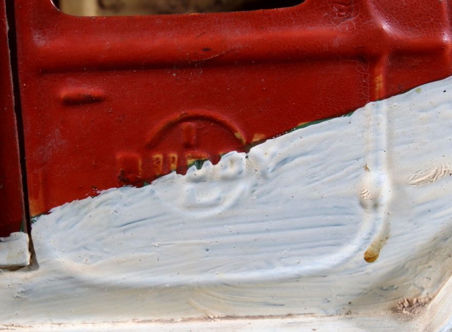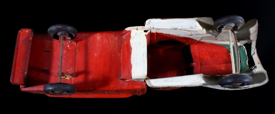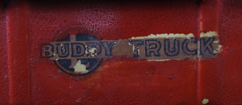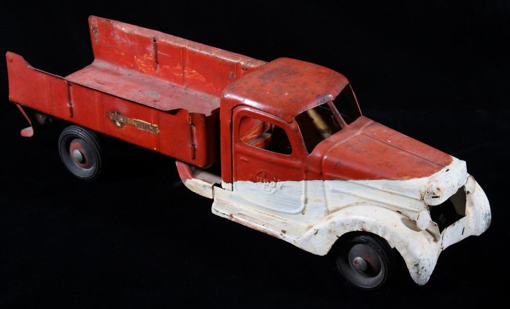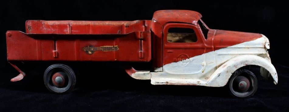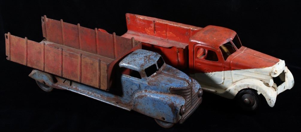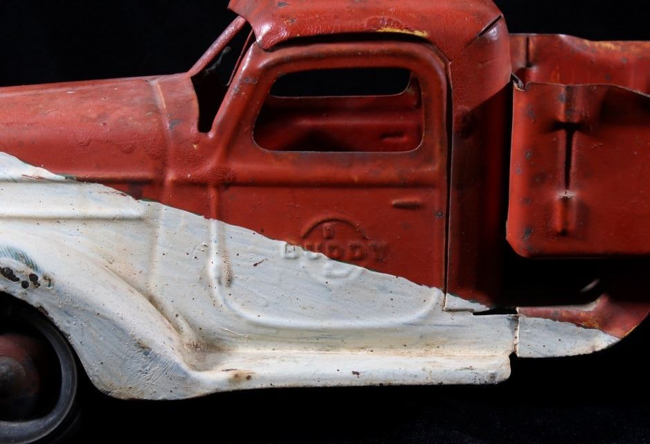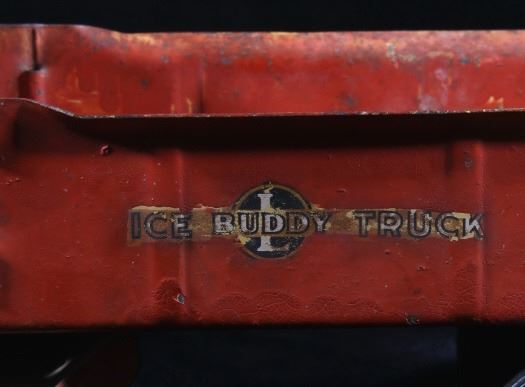 Offered in this lot we have a pair of metal toy dump and ice trucks originating from the mid 20th century. The set consists of a Buddy ice truck and an unmarked dump truck. The first of the trucks shows a red and white paint job with the white portion hand painted. The piece is constructed out of thin sheets of steel with plastic tires. The side of the cab are embossed reading "Buddy" with the left side of the back showing a sticker reading "Buddy Truck" and the right side reading "Ice Buddy Truck". The second truck shows a blue and red coloration with similar steel sheet construction. The back of the truck features a dump truck bed with a lever on the side to lift the bed. The trucks show fair condition overall for their age with some visible rust and wear across both pieces. The Buddy truck measures 20 1/4" long by 6" wide and 6 1/4" tall with the second truck measuring 20" long by 5 3/4" wide and 5 3/4" tall.