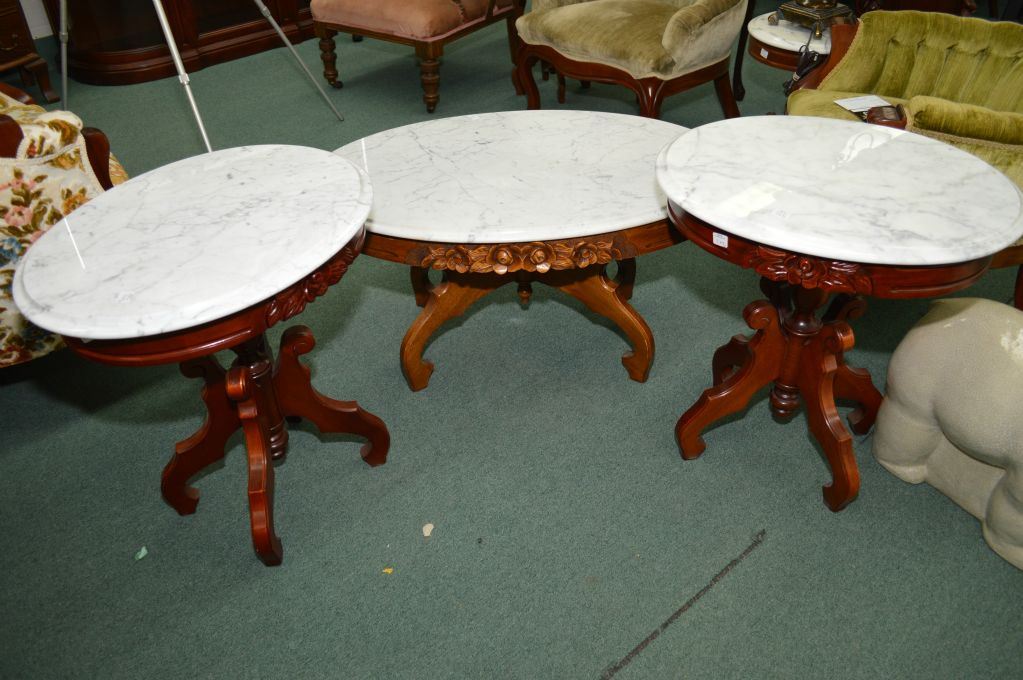 Mid 20th century Victorian reproduction coffee and two end tables with carved floral skirts, center pedestal and marble tops
