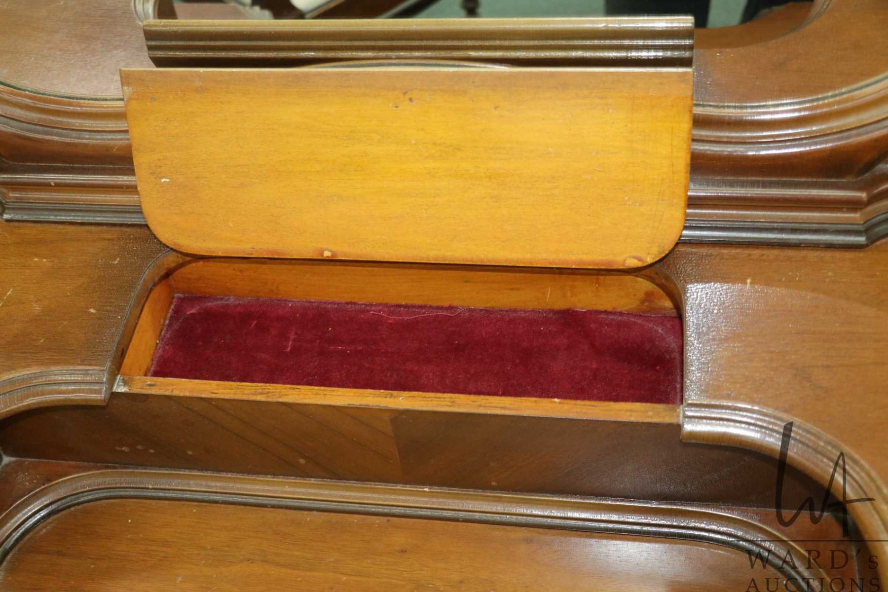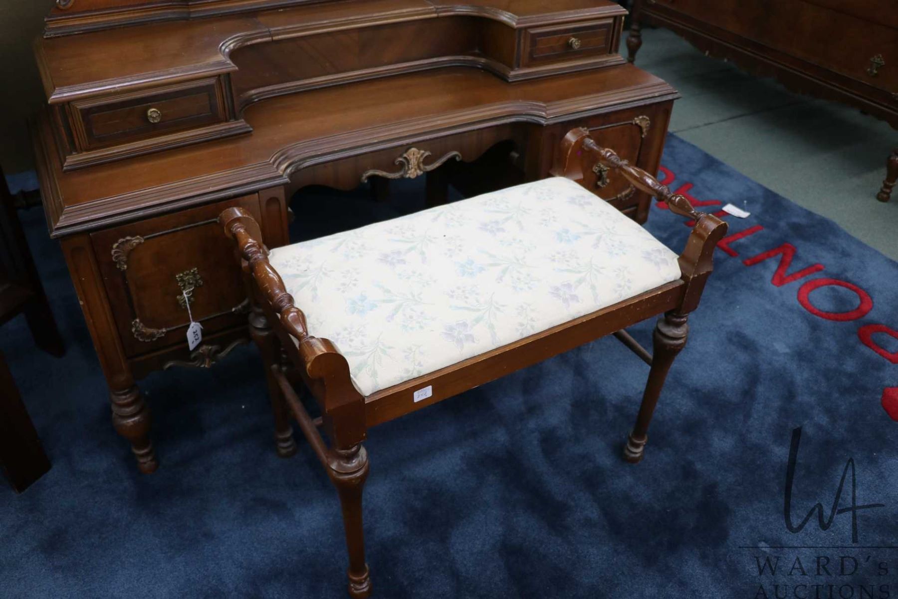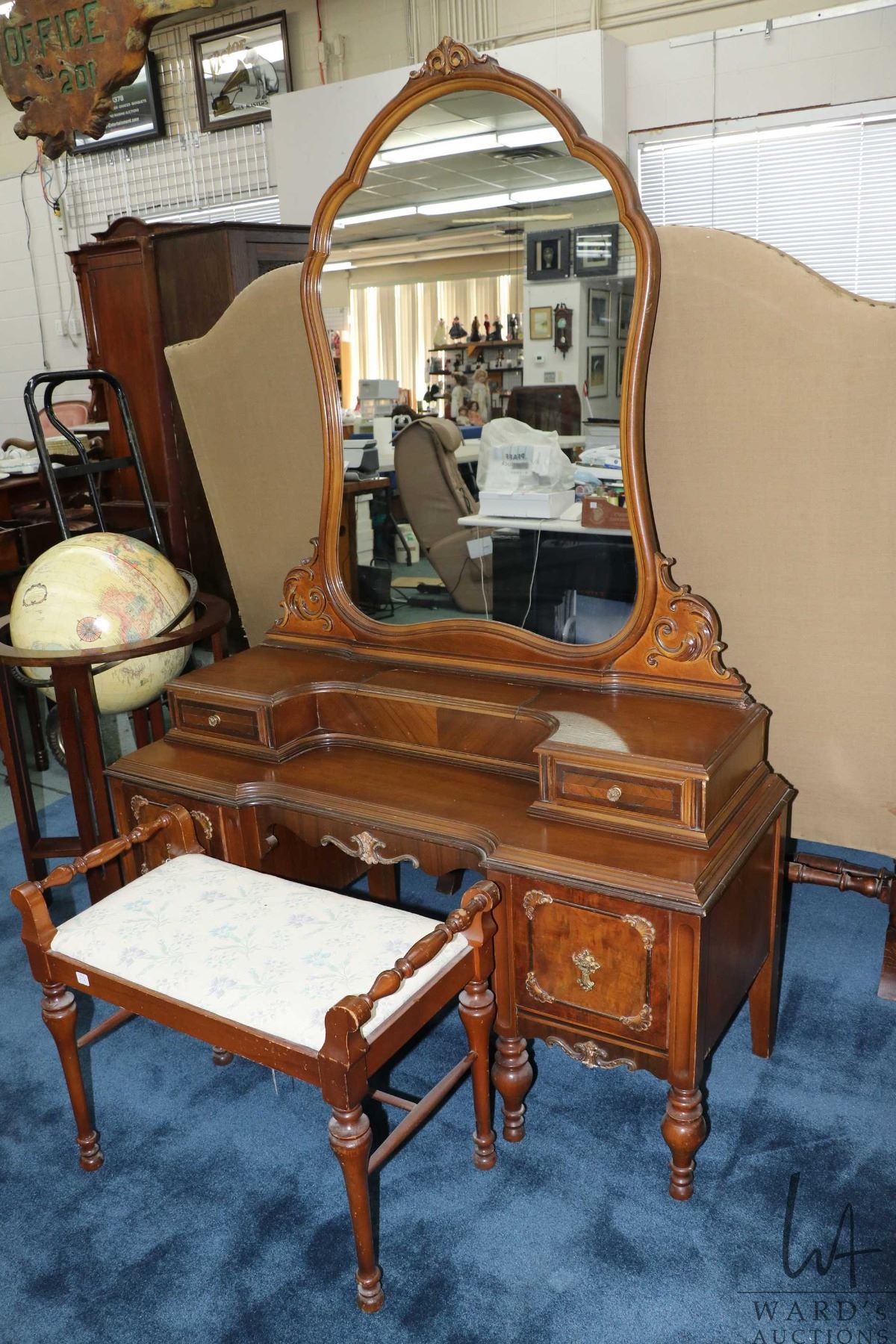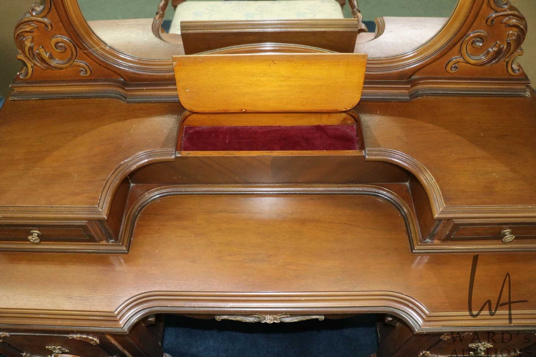 Mid 20th century mirrored walnut vanity with matching upholstered stool, 27" to top of cabinet, 71"