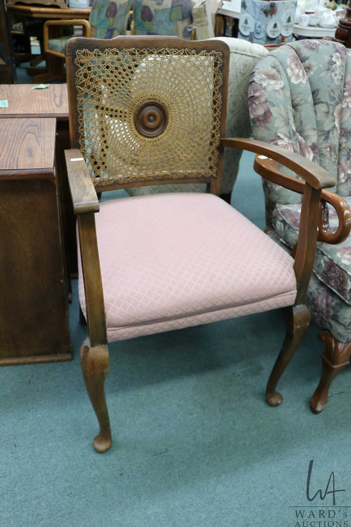 Mid 20th century open arm parlour chair with woven rattan and turned cameo back