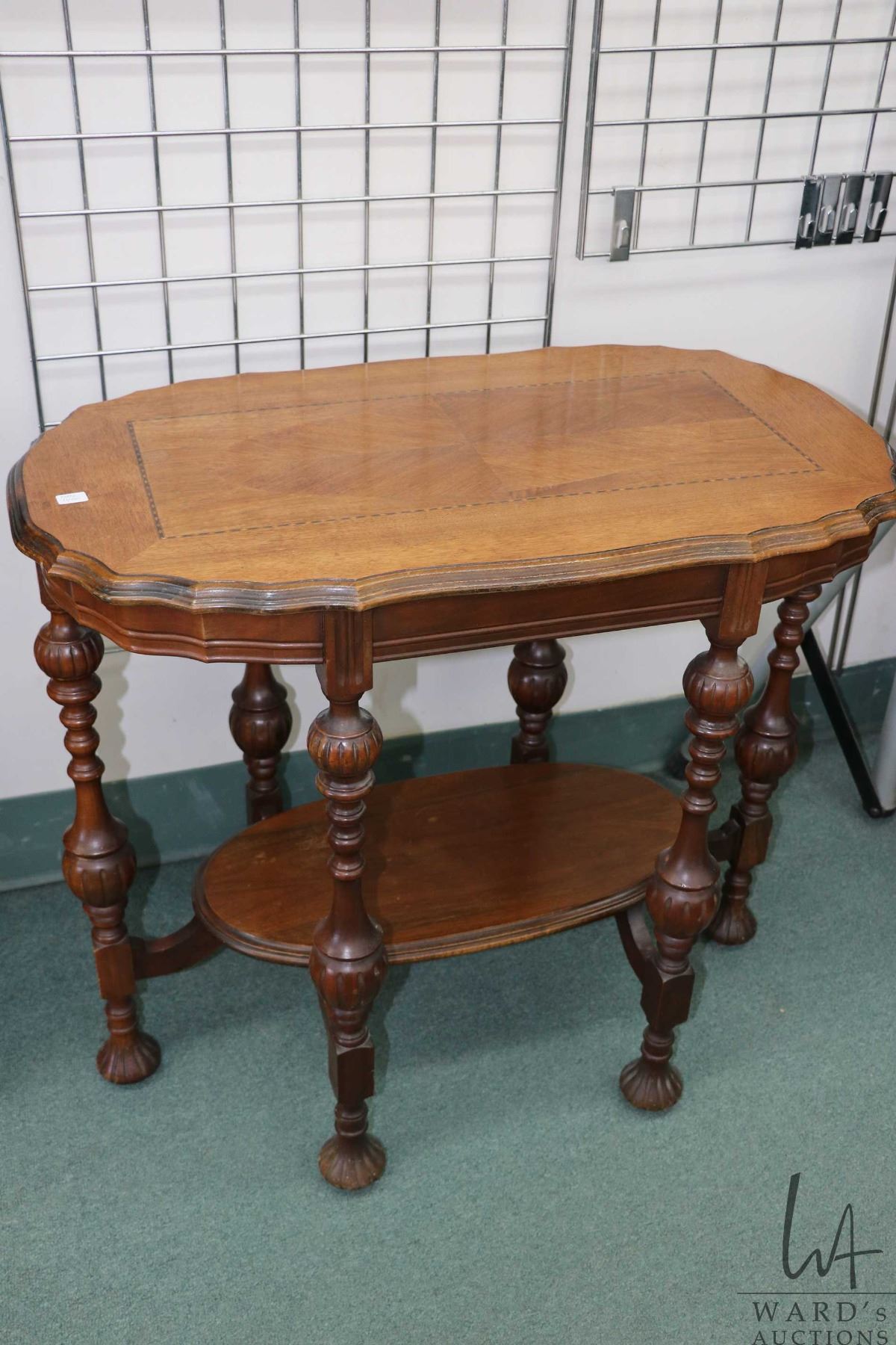 Mid 20th century, six legged occasional table with matched grain and inlaid top, under shelf and bulbous supports, 30" X 34" X 20"