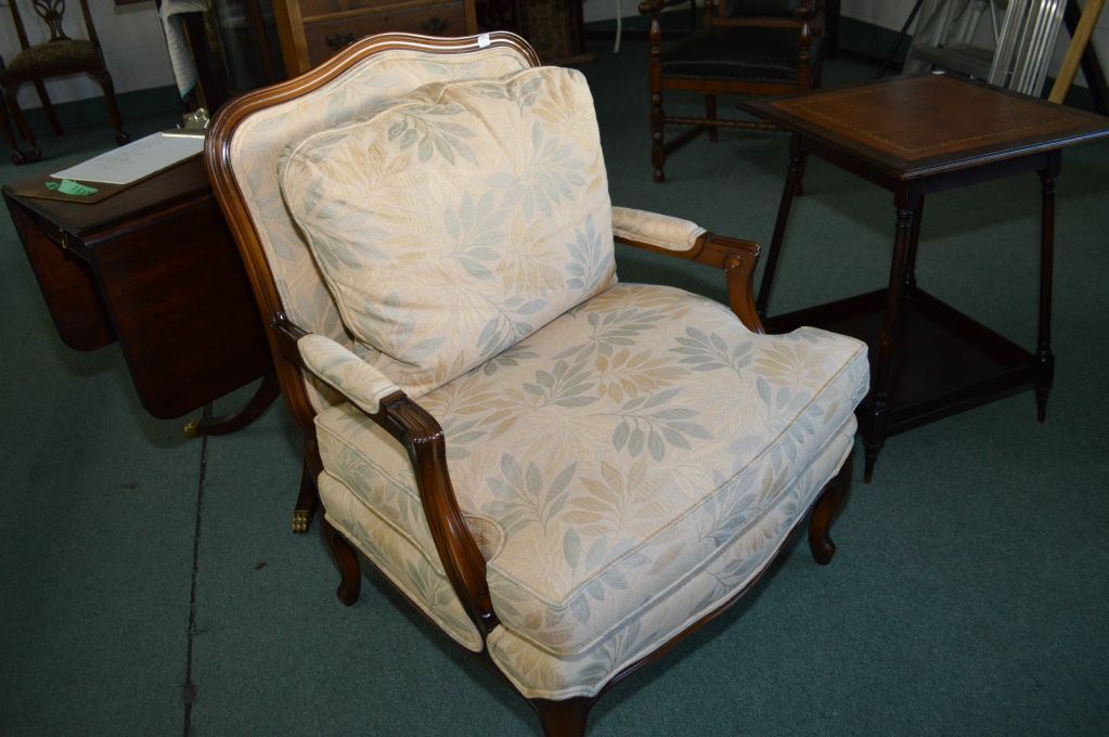 Mid 20th century style open arm foliage motif upholstered parlour chair made by Barrymore