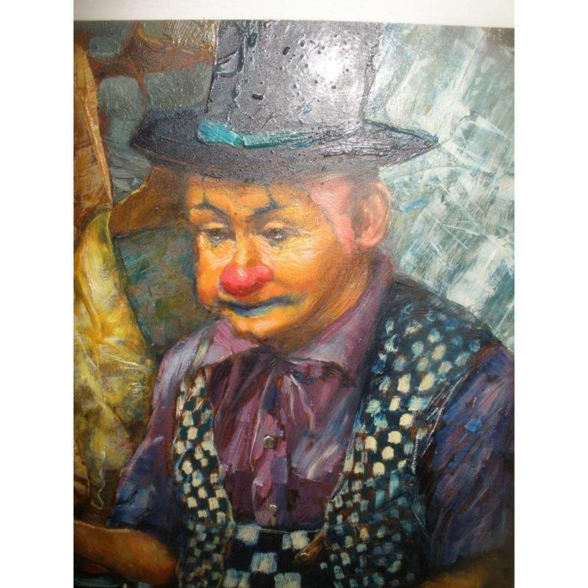 Mid 20th Century modern painting. Herbert B. Russin ( American / Russian 1892-1970 ) "The Juggler", Original oil on masonite board painting. Signed bottom left "Russin". 10" X 14" in wood frame with linen liner. Herbert Russin exhibited with the Society of Independent Artists.Â