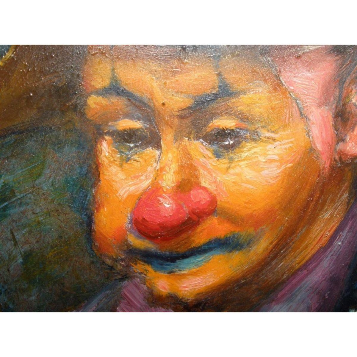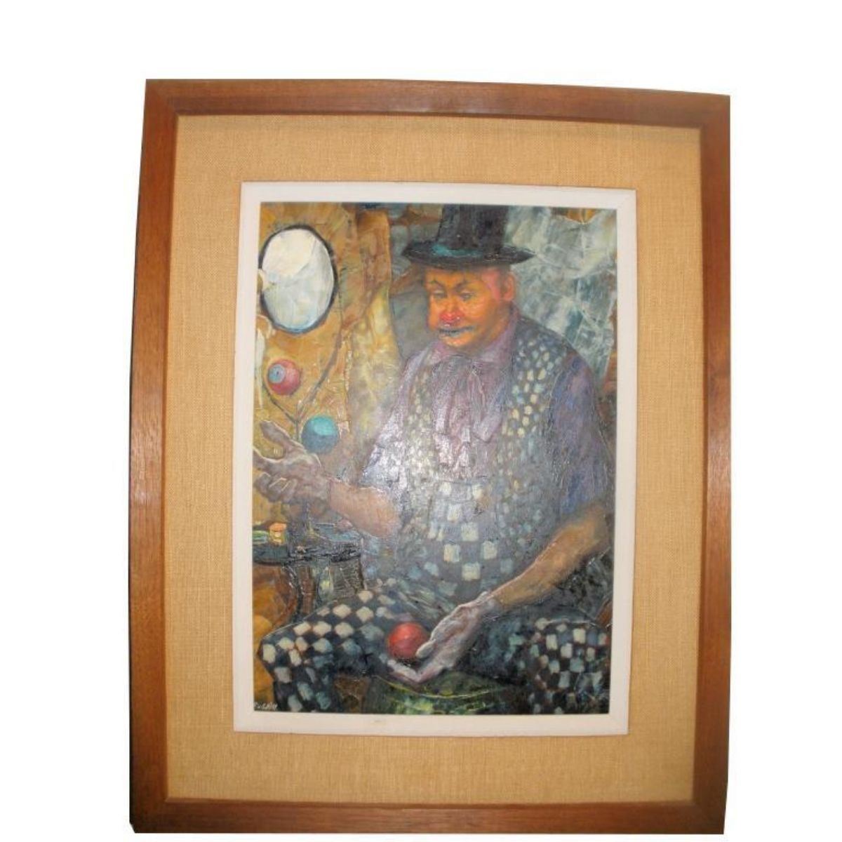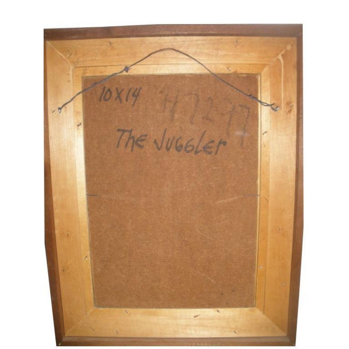 Mid-20th Century modern painting. Herbert B. Russin ( American / Russian 1892-1970 ) "The Juggler", Original oil on masonite board painting. Signed bottom left "Russin". 10" X 14" in wood frame with linen liner. Herbert Russin exhibited with the Society of Independent Artists.Â