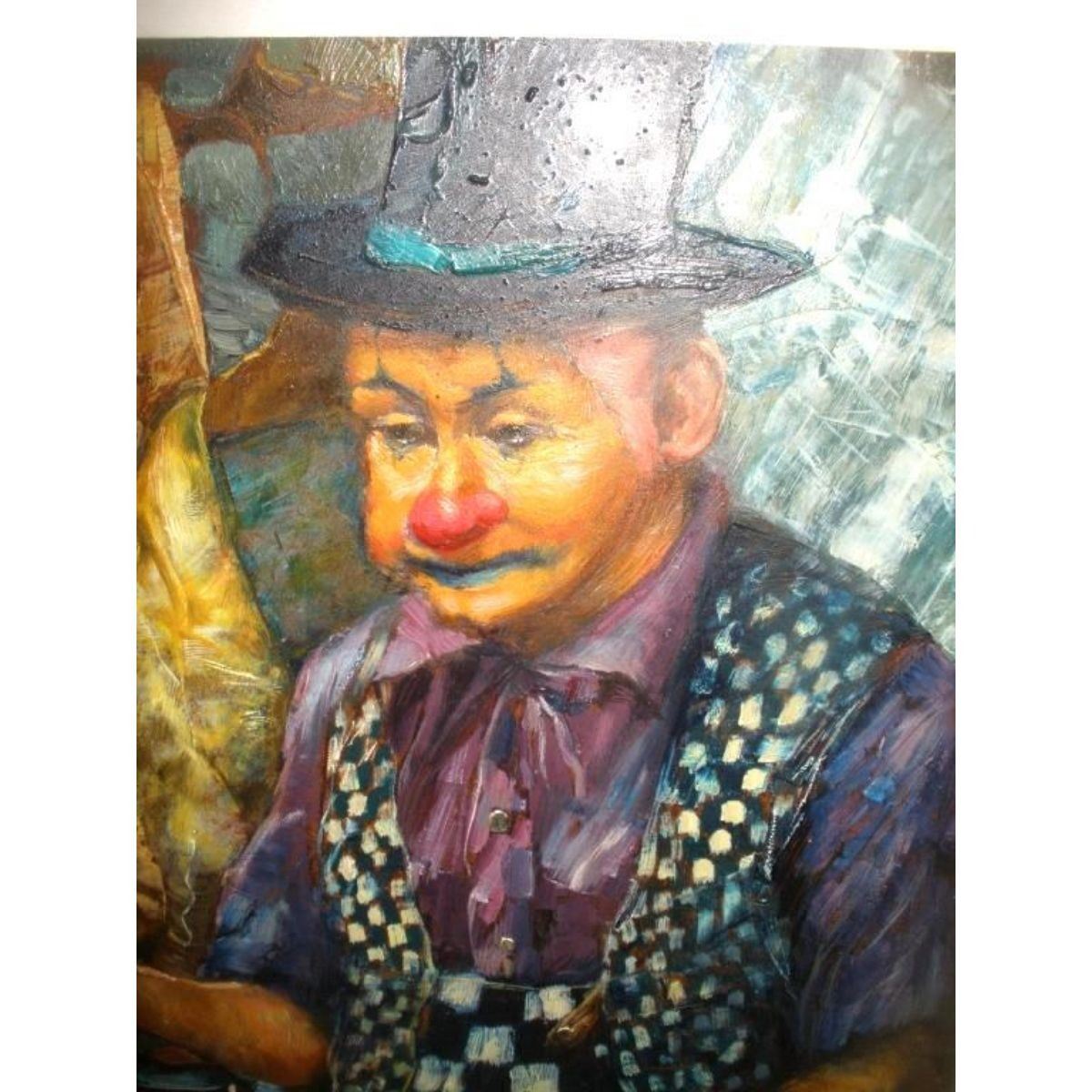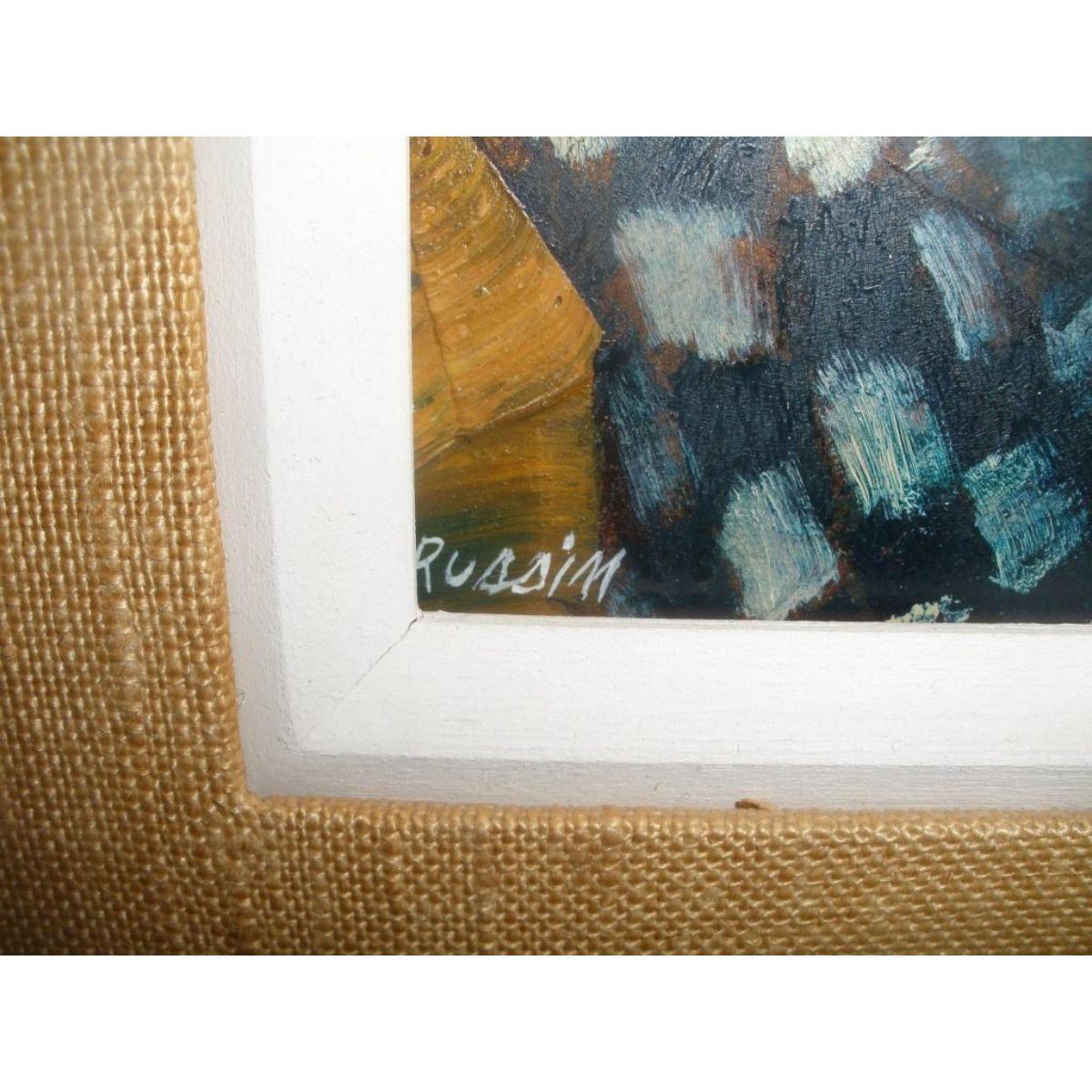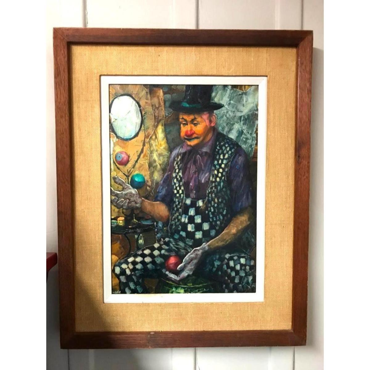 Mid-20th Century modern painting. Herbert B. Russin ( American / Russian 1892-1970 ) "The Juggler", Original oil on masonite board painting. Signed bottom left "Russin". 10" X 14" in wood frame with linen liner. Herbert Russin exhibited with the Society of Independent Artists.Â