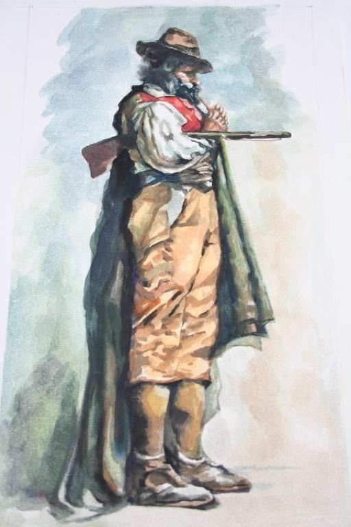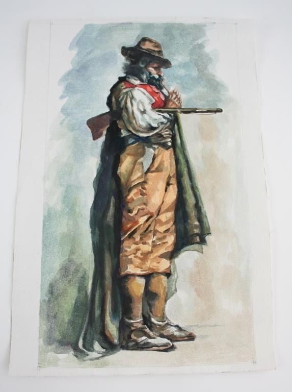 Mid 20th century, watercolor painting on heavy stock paper, depicts a hunter in cloak, smoking a pipe & holding a double barrel shotgun. Image size is 8" X 14".