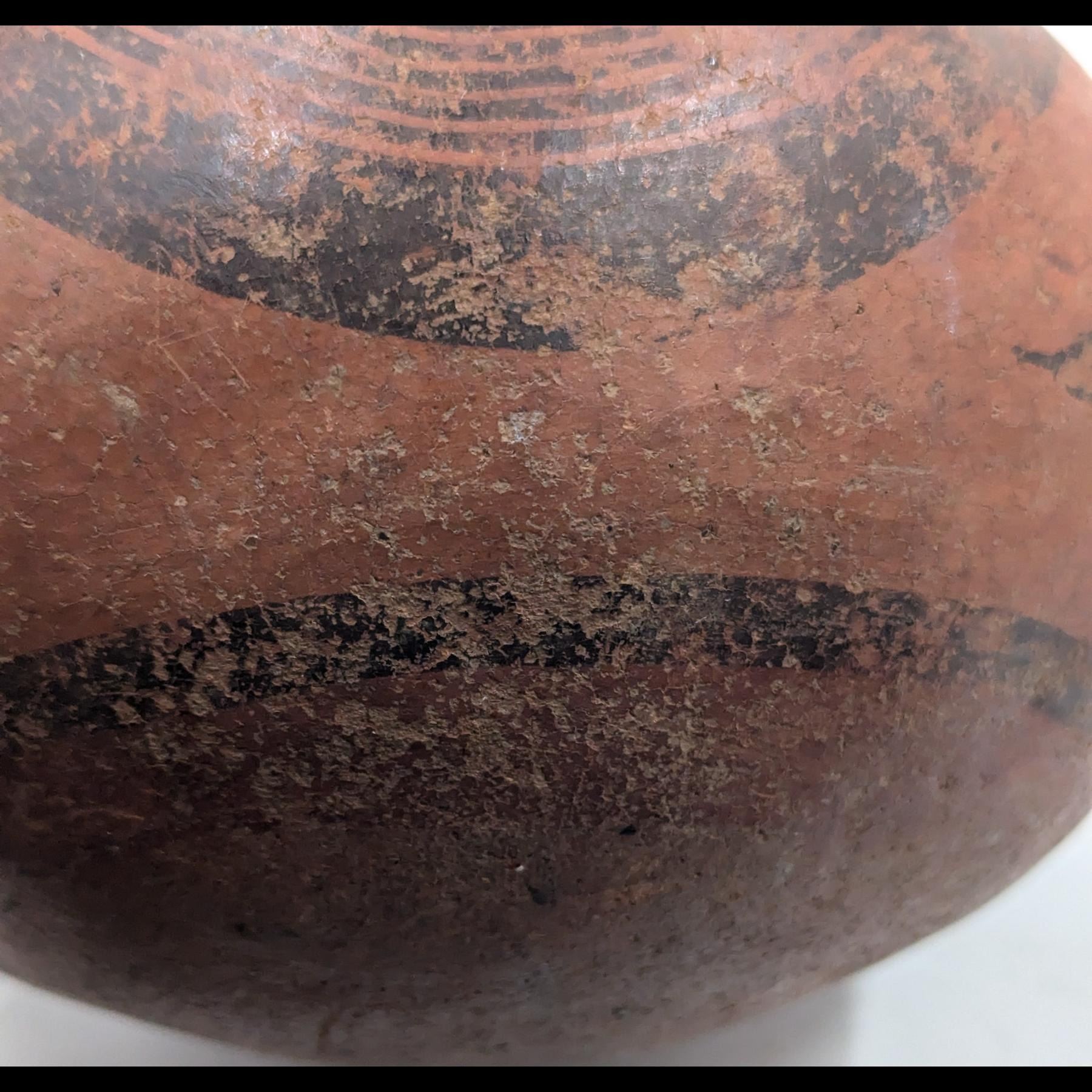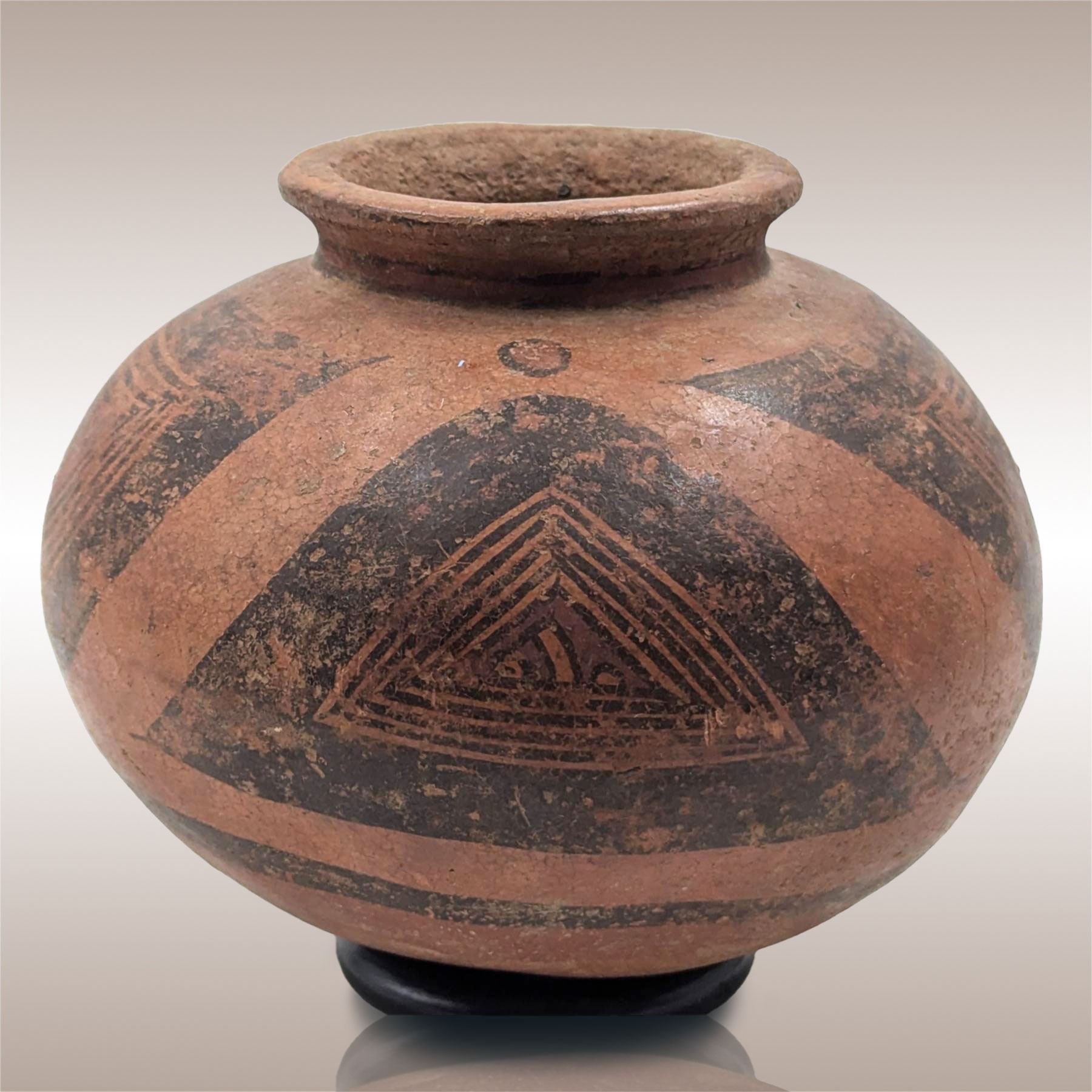 Mid-American Redware Pot, Possibly Prehistoric, decorated with black geometric patterns. There is a finely cut slit on the upper side of the vase. Measures approx. 5" X 6".DOES NOT COME WITH STAND.