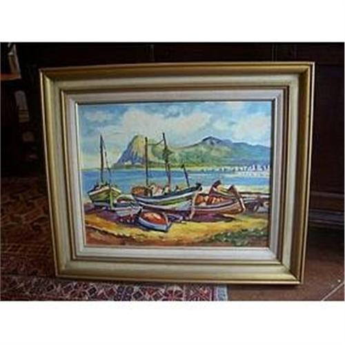 Offered here is a very nice mid century painting, very much in the colorful and spontaneous style of the early Fauvists. The painting depicts small Italian fishing boats pulled up together on the shore. Hills and a suggestion of a village are in the background, but the bright colors and pleasing form of the boats really draw your eye. The painting is signed in the lower right corner, Geneva. It is framed in a gilt wood and painted frame with a linen liner. As framed, the painting measures 24" by 20". There is some light spotting on the liner, but otherwise the painting is fine.