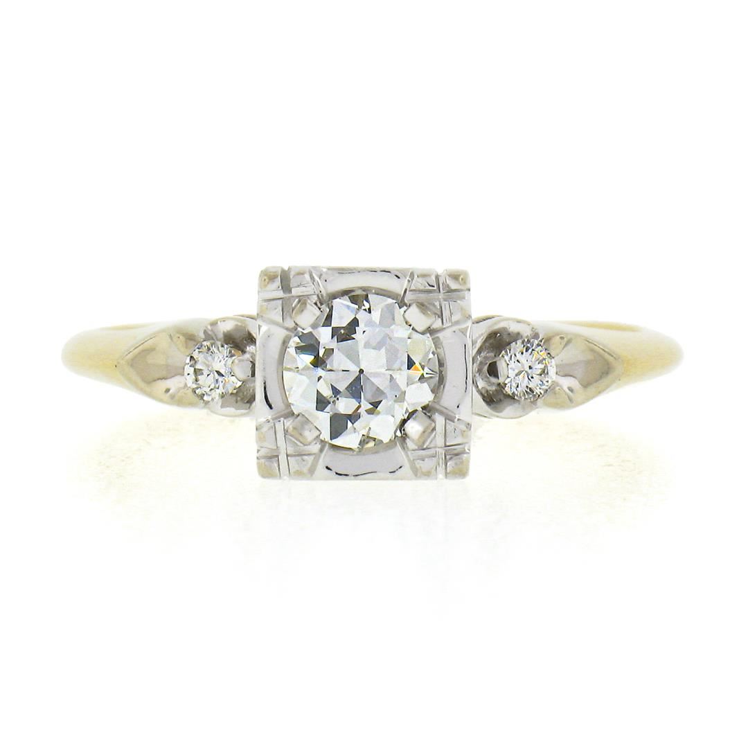 A vintage solid 14k yellow & white gold engagement ring, with 1 old european cut & 2 round cut natural diamond (G/H - VS1/VS2 ; 0.52ctw). The ring is size 8.5, weighs a total of 2.82 grams, and measures 6.8mm wide.