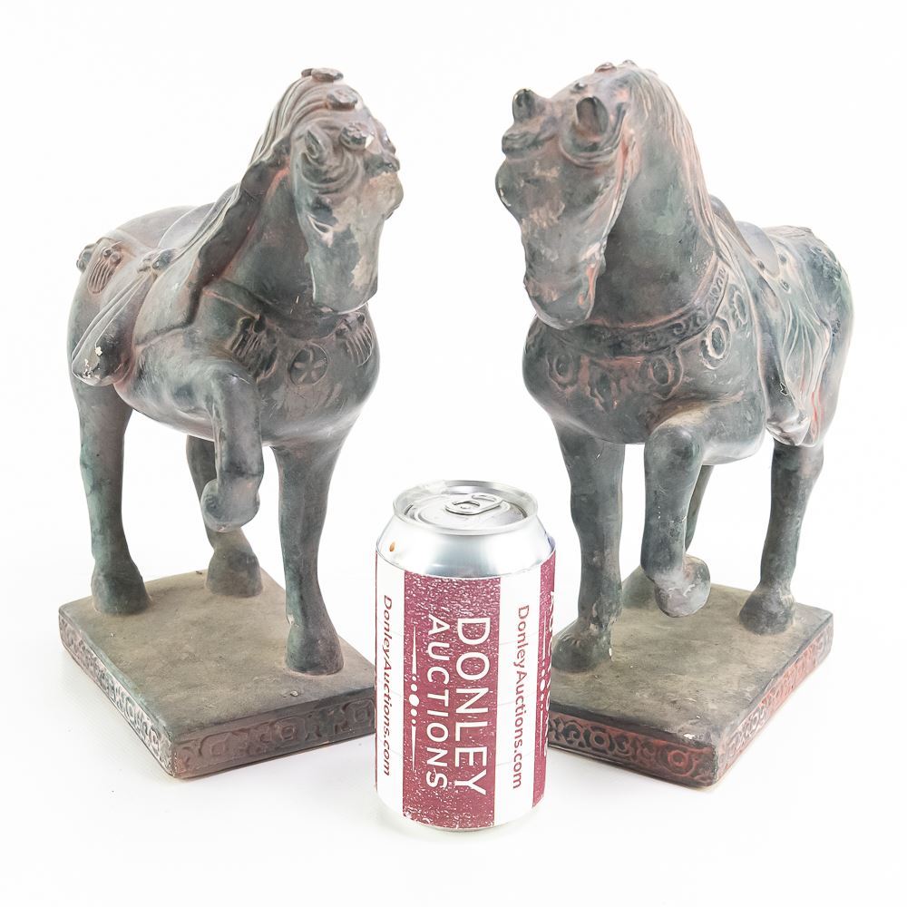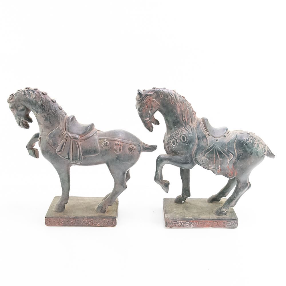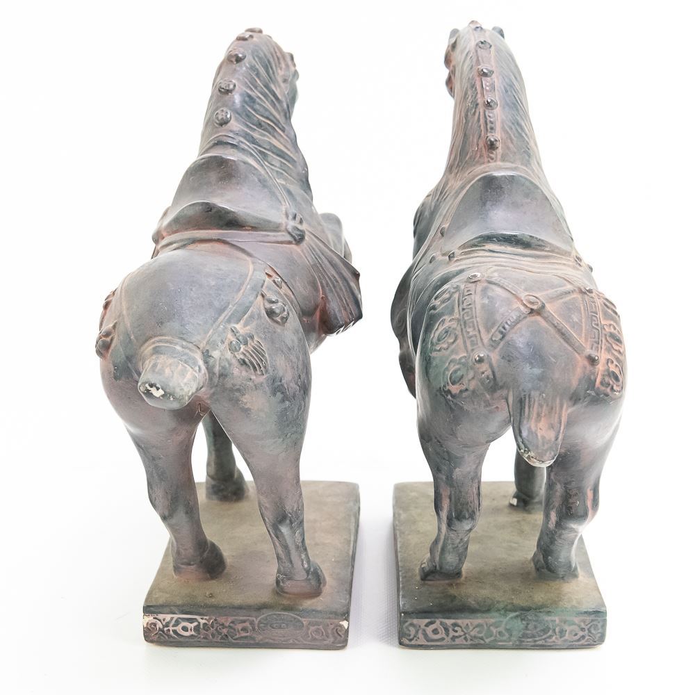 Attractive 11" ABCO Alexander Backer mid century chalkware show horse & war horse statue pair. In good overall condition with signs of age including light discoloration, chips, paint loss along with a couple small cracks on some of the legs; only noticeable under close examination. Perfect addition to your home or office. Please use photos to judge condition and bid accordingly.