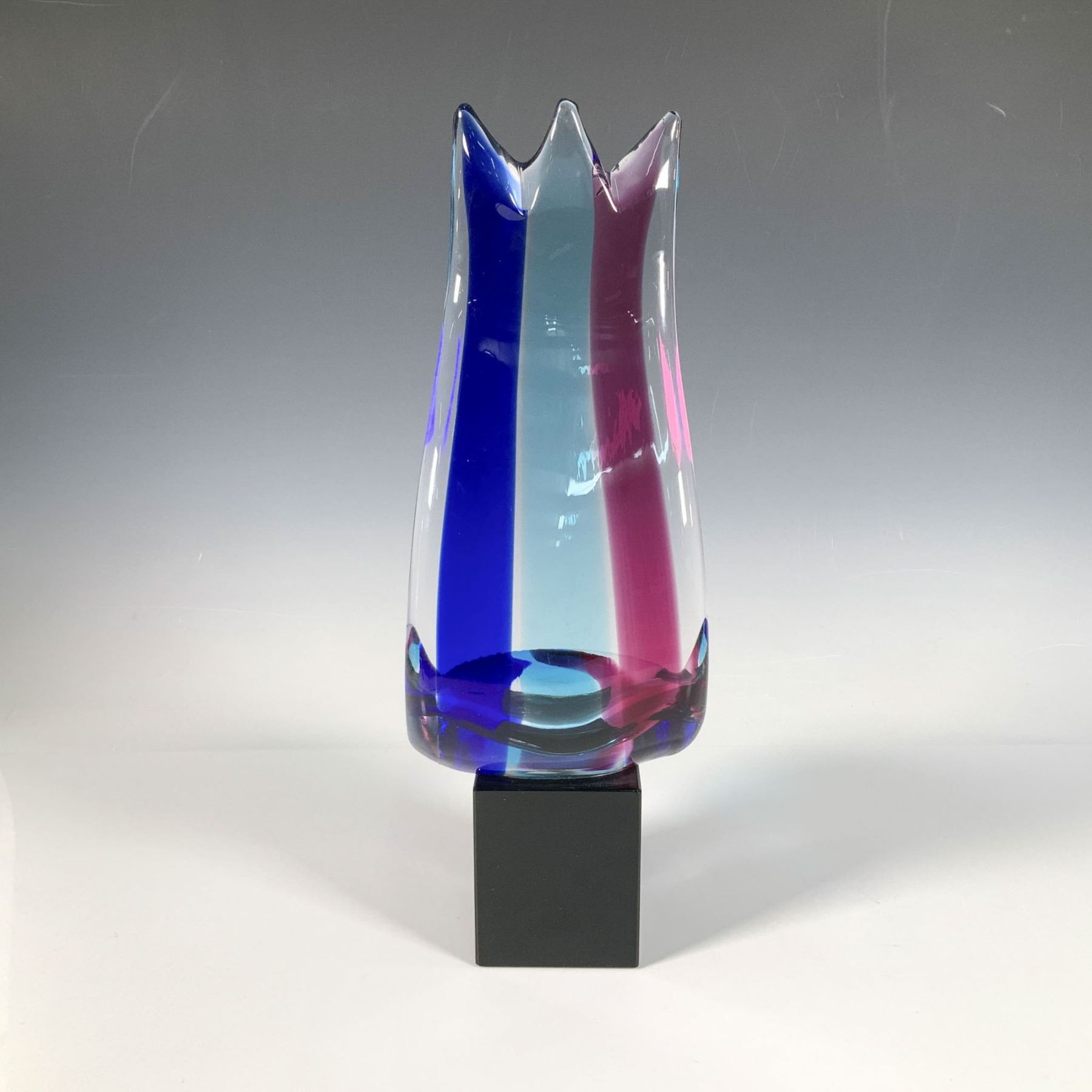 This dynamic hand-blown decorative art piece, crafted with vibrant shades of blue and purple alongside clear glass, features a thick, curved form resembling a chair with three spikes at the top, elegantly resting on a sleek black square base.