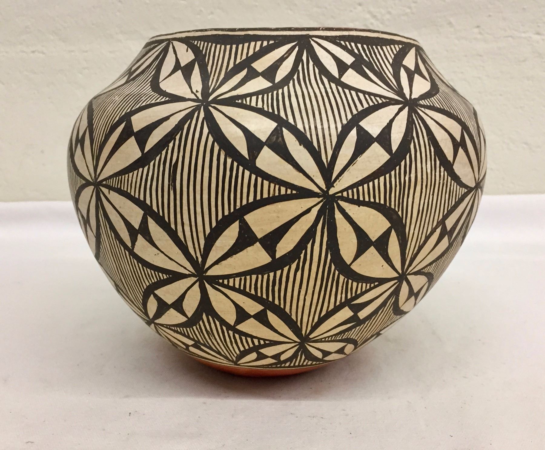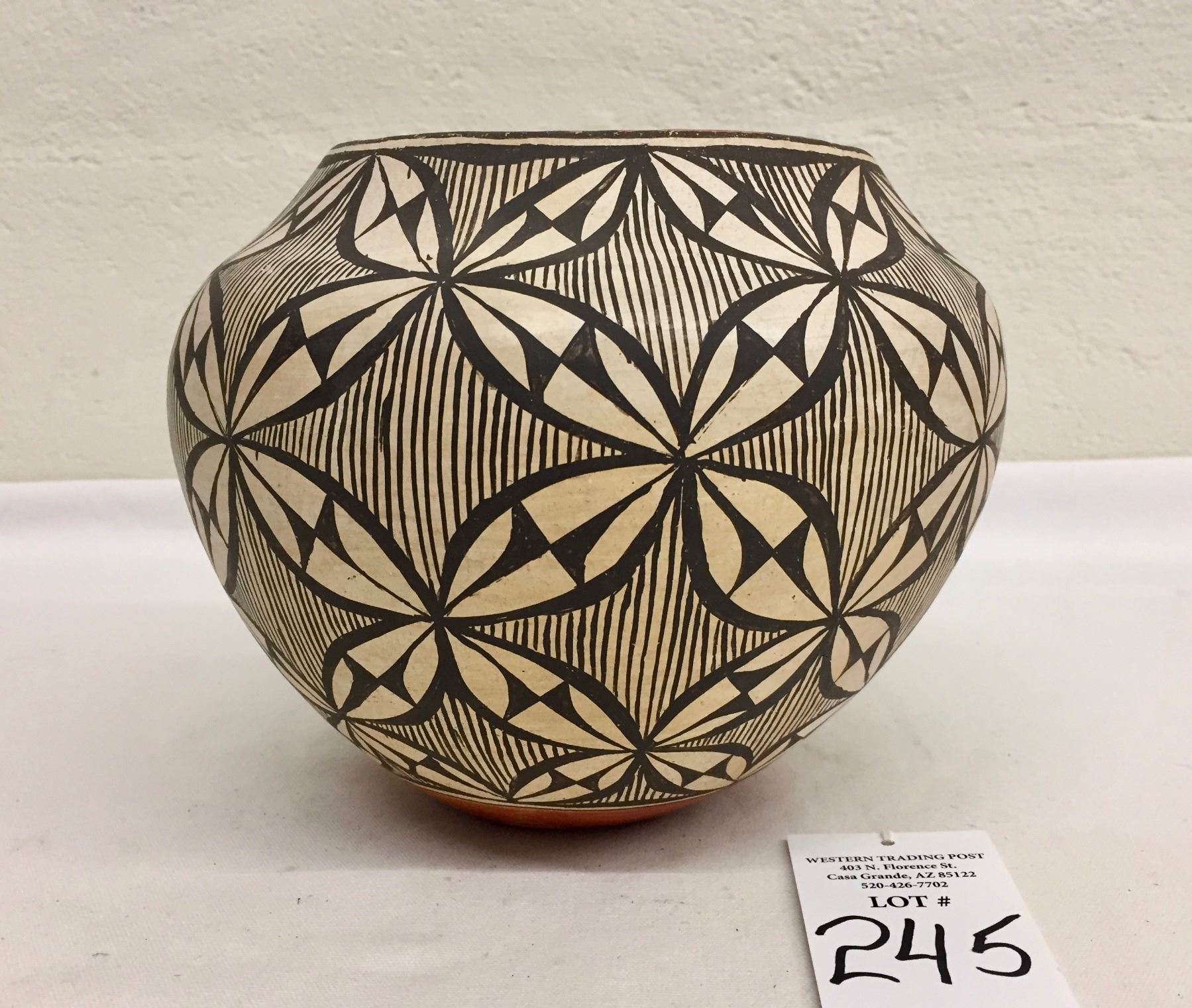 Description: A nice, older (Circa mid-century) pottery jar from Acoma Pueblo. Maker: Unknown Acoma potter. Approx. Age: Circa mid-century. Size: Approx. 8-1/4”w x 6-3/4” deep. Condition: Good for its age, normal wear expected. Please look closely at the pictures - they are an important part of our description. Shipping: There will be a $10 handling / packaging fee for shipping this lot. The actual cost of postage will be added on top of that.