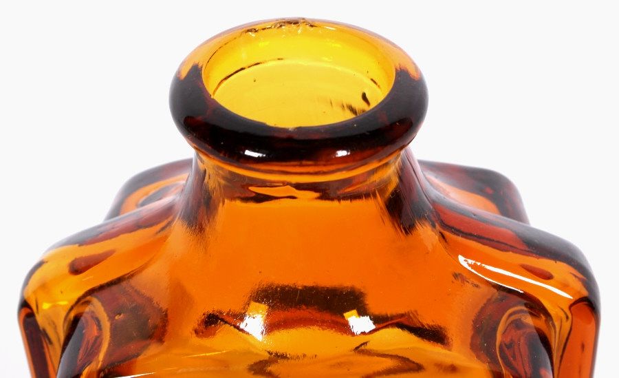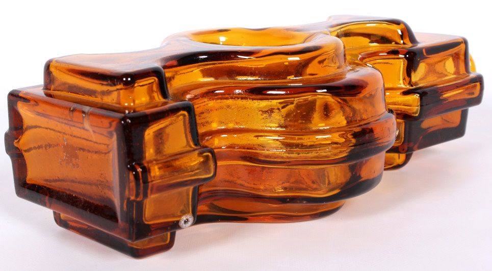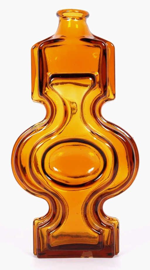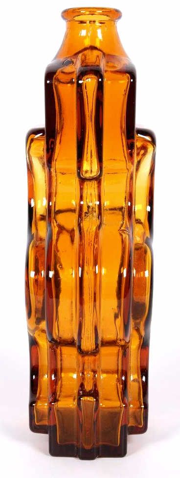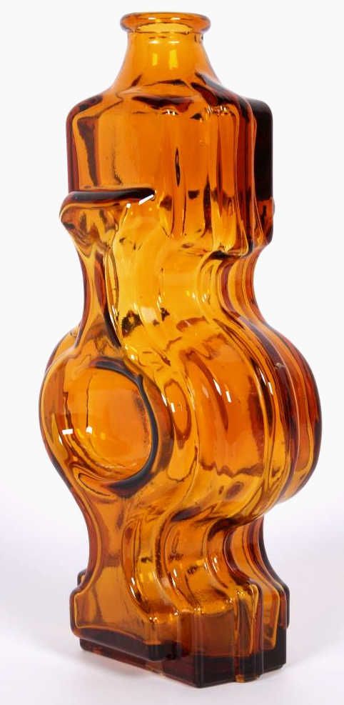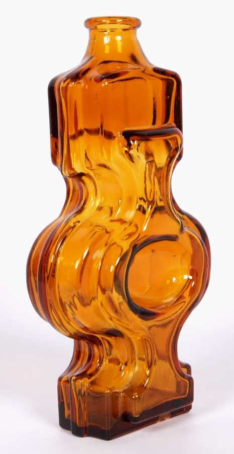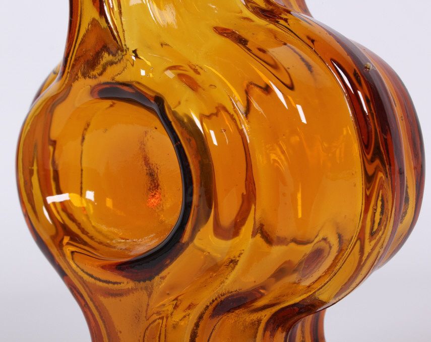 This is a hand blown into a mold work of art glass and is from the 1940's. The piece has a very rare form with a wonderful amber color and no etching. The piece measures 10" tall and 5.25" at its widest point.