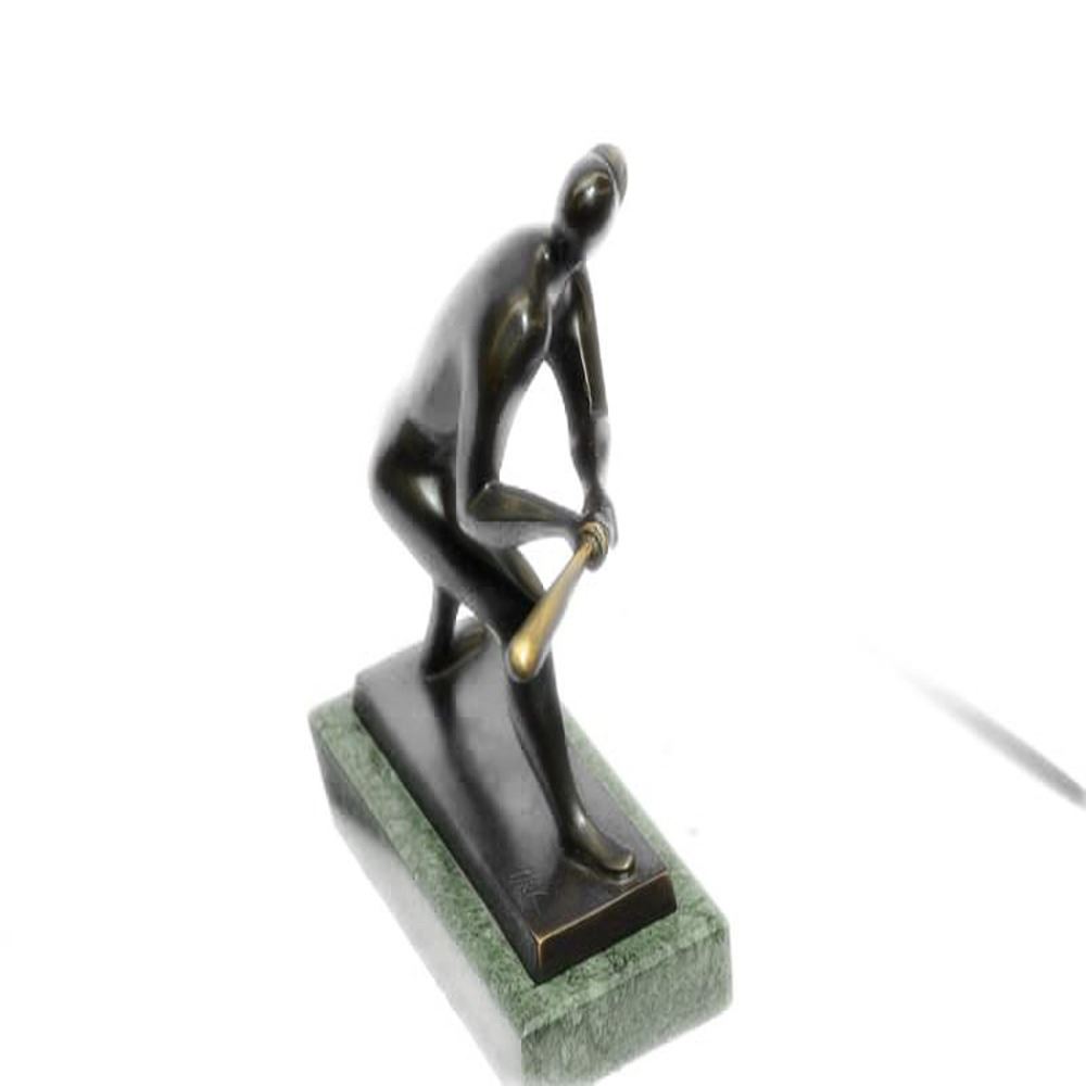 Hes up at bat. He eyes the pitcher to see what his pitch might be. The ball spirals towards him. He times it and then swings. He plants his feet. His knee bends and his torso twist with the swing. He wears a typical baseball uniform, complete with a batting helmet. This would make a great gift for the baseball lover in your life. This brown patina Sculpture was cast using the Lost Wax Method and mounted on a marble base. Bronze Dimensions with Marble Base:Height 8 X Width 7 inches. Weight: 6 LBS.