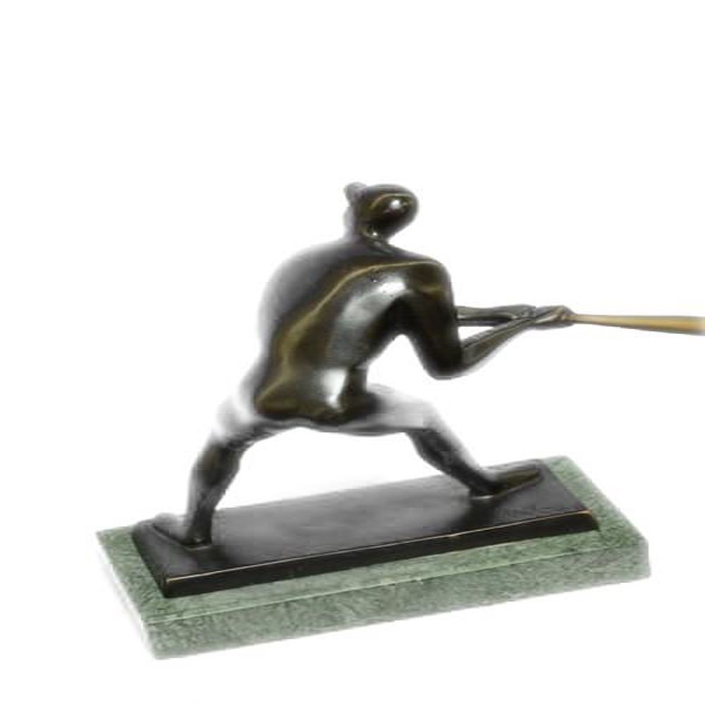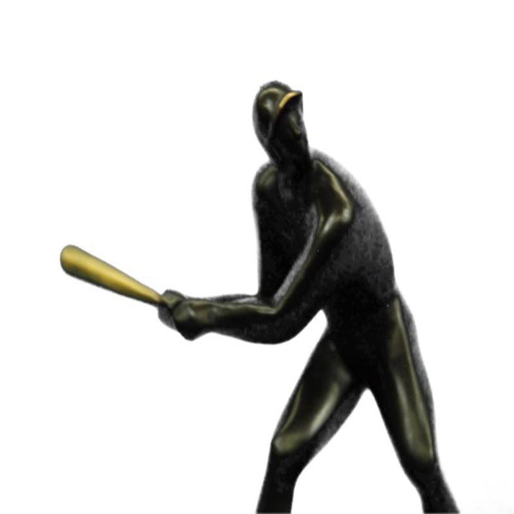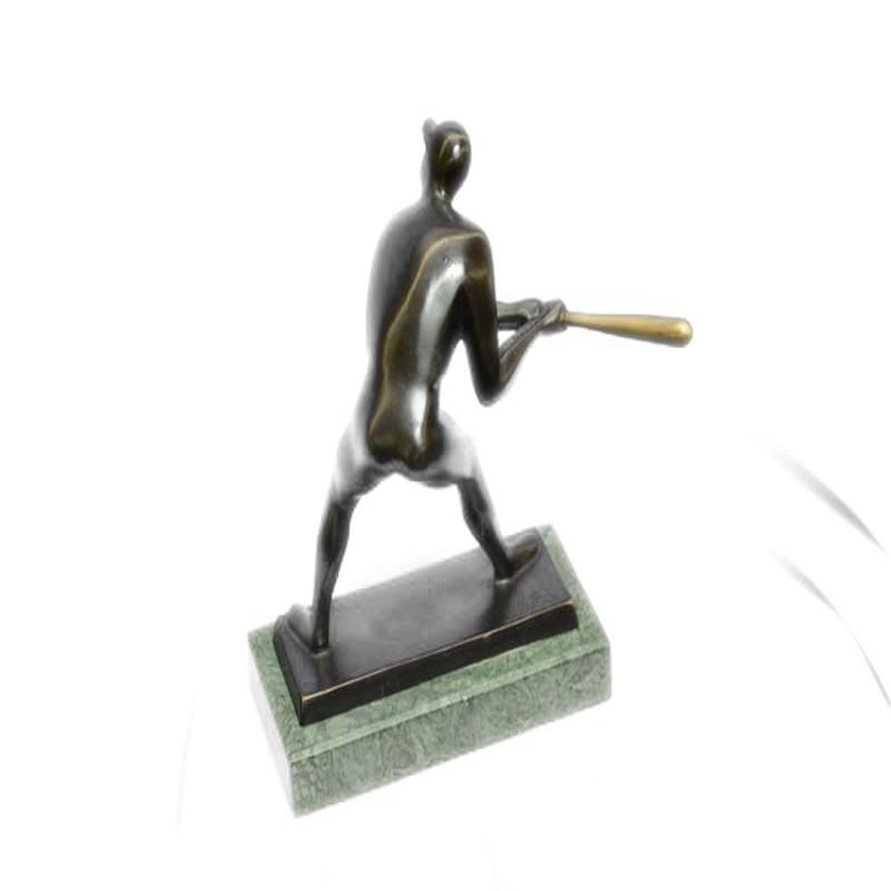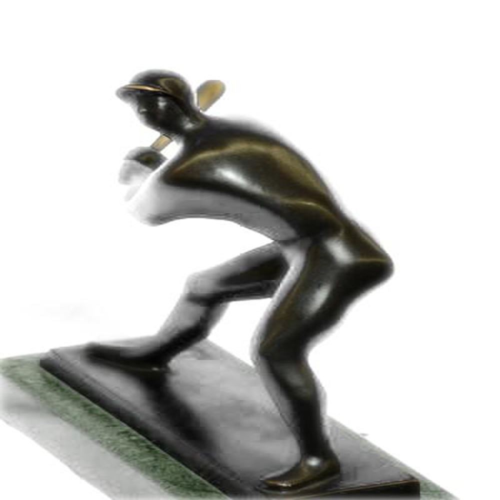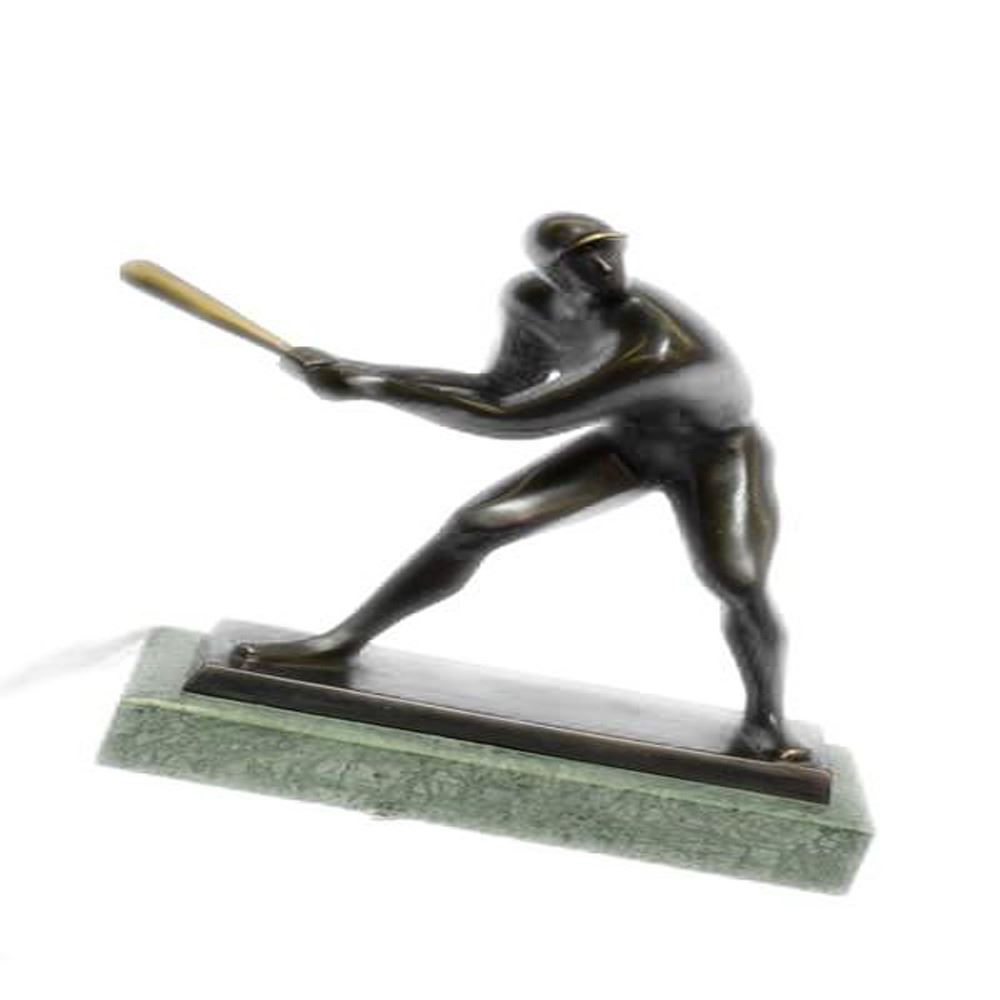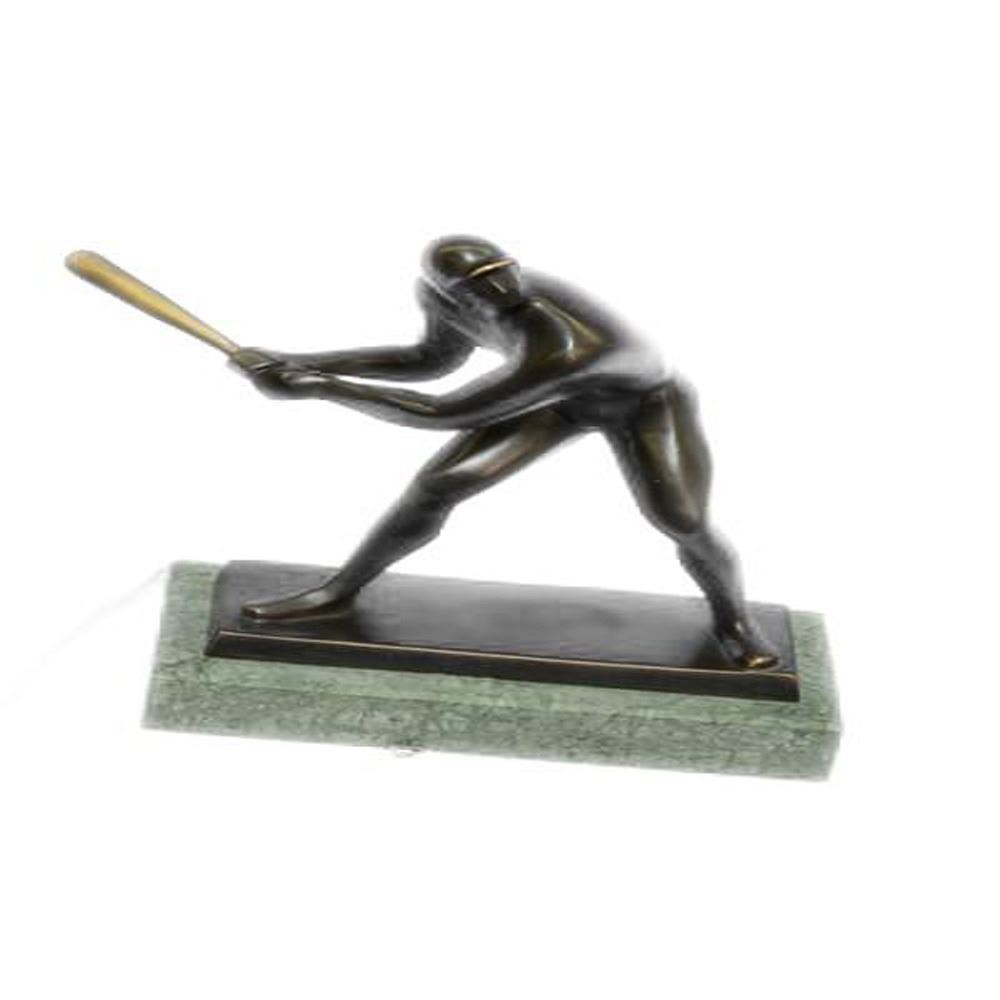 His up at-bat. He eyes the pitcher to see what his pitch might be. The ball spirals towards him. He times it and then swings. He plants his feet. His knee bends and his torso twist with the swing. He wears a typical baseball uniform, complete with a batting helmet. This would make a great gift for the baseball lover in your life. This brown patina Sculpture was cast using the Lost Wax Method and mounted on a marble base. Dimensions: Height 8 X Width 7 inches. Weight: 6 LBS.