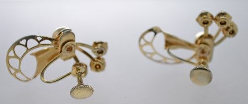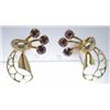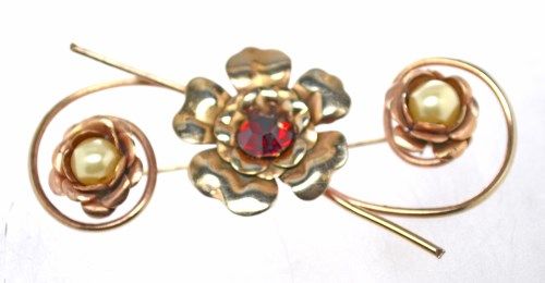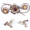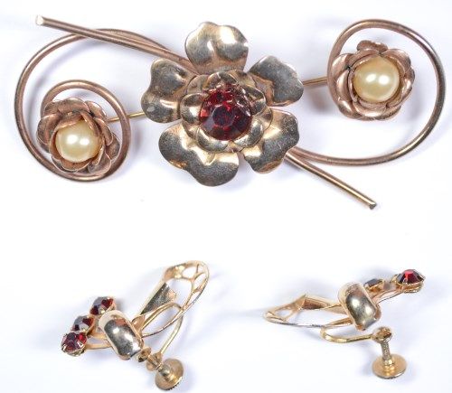 Mid-Century Brooch and Earrings with red rhinestones and faux pearls.