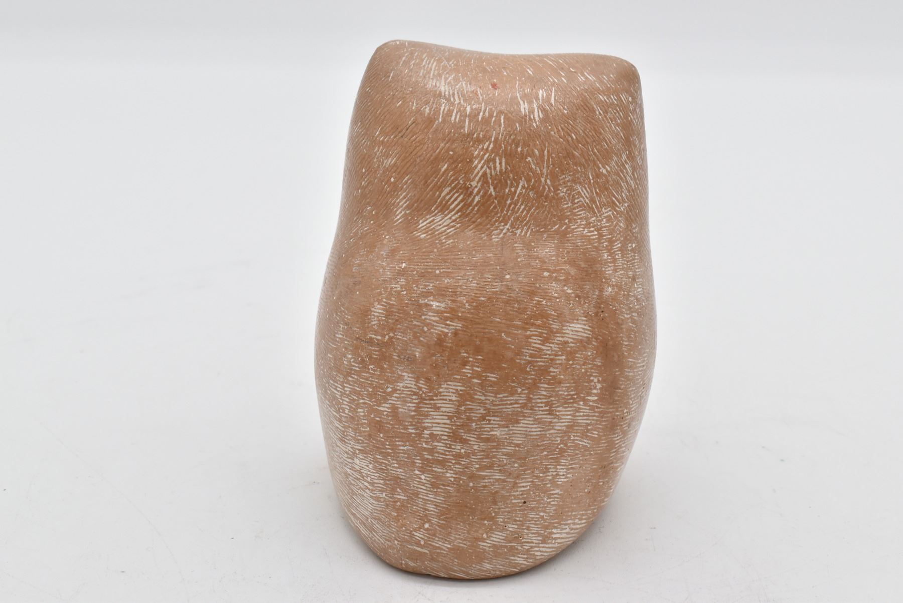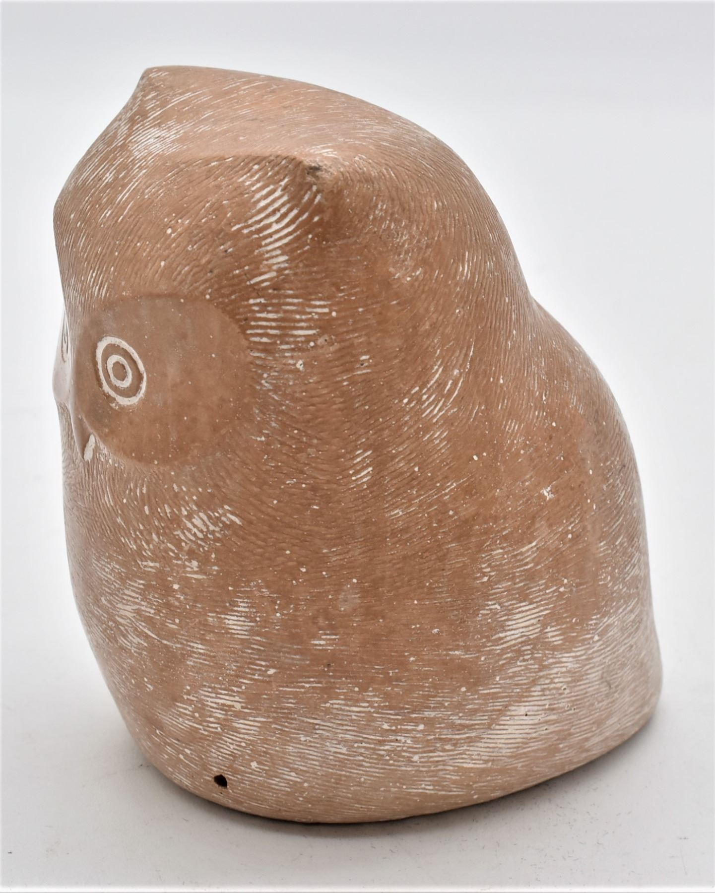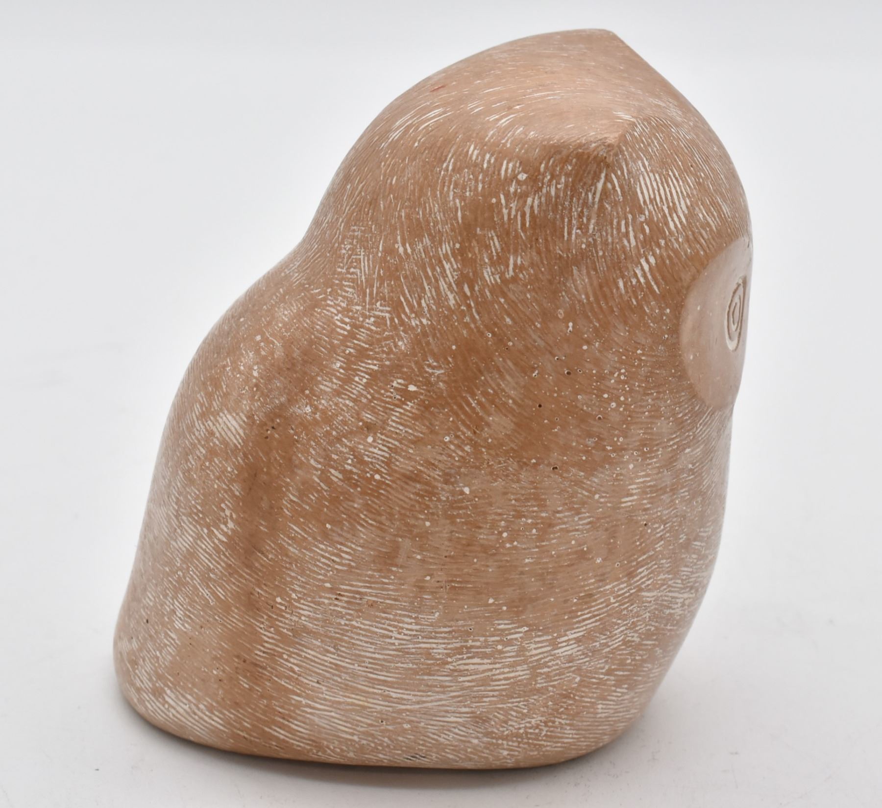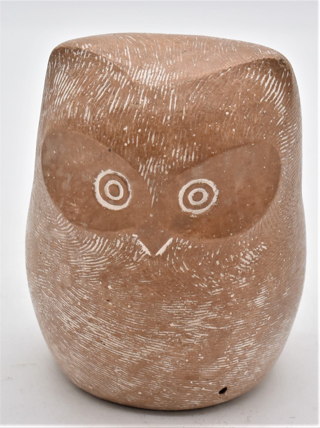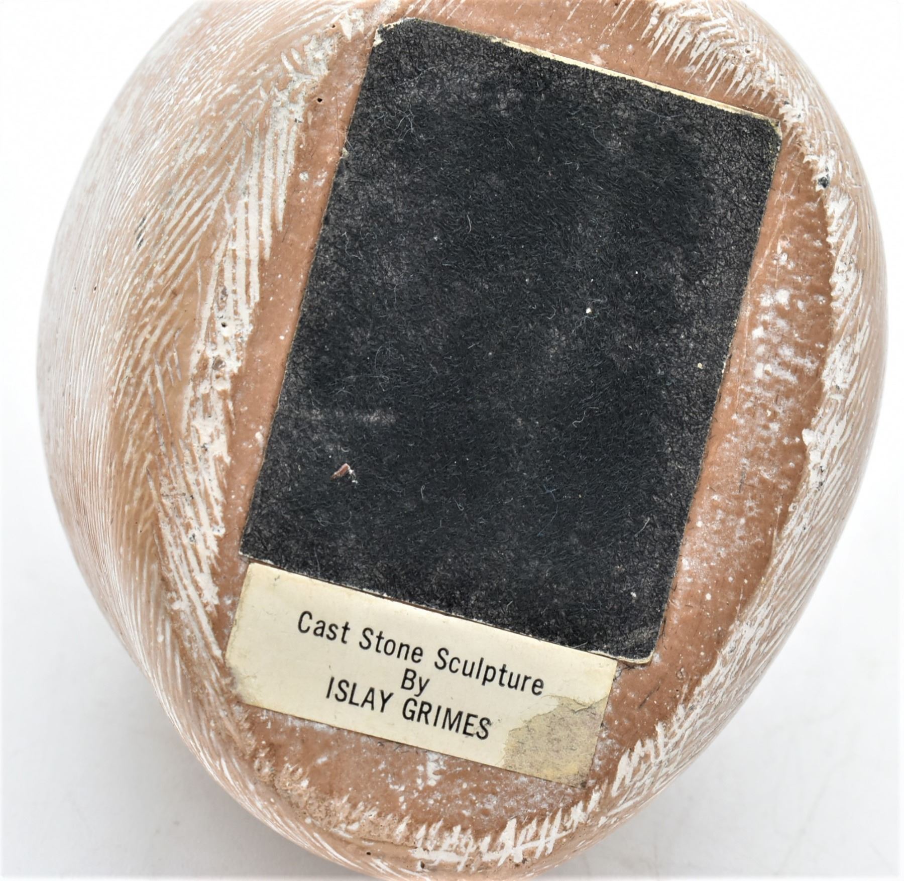 Mid-Century Cast Stone Owl by Islay Grimes, measures 4" x 4" and has original tag on the bottom, FYI: "New York artist Islay Grimes was known for his modern small animals and birds sculptures in cast stone made in the 60s and early 70s. His style is similar to Noguchi's cast stone sculptures, minimal and somewhat stylized. However there is not much known about Grimes' life. The cast stone has a light nutmeg brown hue with hundreds of incised sgraffito marks giving the impression of feathers. On the underside is the original black felt and paper tag. The tag reads "Cast Stone Sculpture by Islay Grimes."