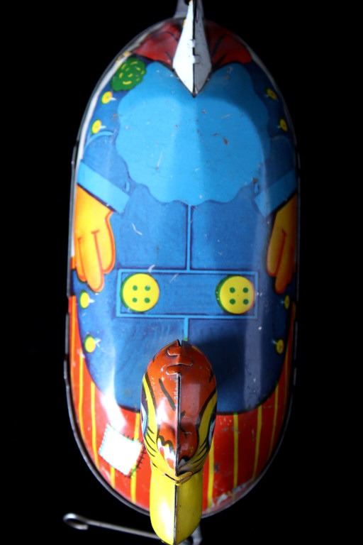 For your consideration are these early to mid 20th Century children's toys, a tin litho duck and metal pogo shoes. Neither of the toys is marked with a maker or date. The duck is on three small wheels, with the wheel in front positioned in the middle with a hook. Originally the toy could have been hooked to two other ducks, one in front and one behind. The duck toy is red, yellow, orange, black, white and blue; it also has a green plate on the bottom. The pogo shoes are red with white. they were designed to fit over shoes and are adjustable. A heel plate slides forward and back to accommodate different length shoes and a plastic strap with an adjustable bucke fits over the shoe. The bottom platform is white and three red springs support the red shoe portion. Both toys are complete and are in good overall condition. The shoes measure about 10.25" long x 5" wide x 5.5" tall. The duck measures 7.25" long x 3.25" wide x 4" tall.