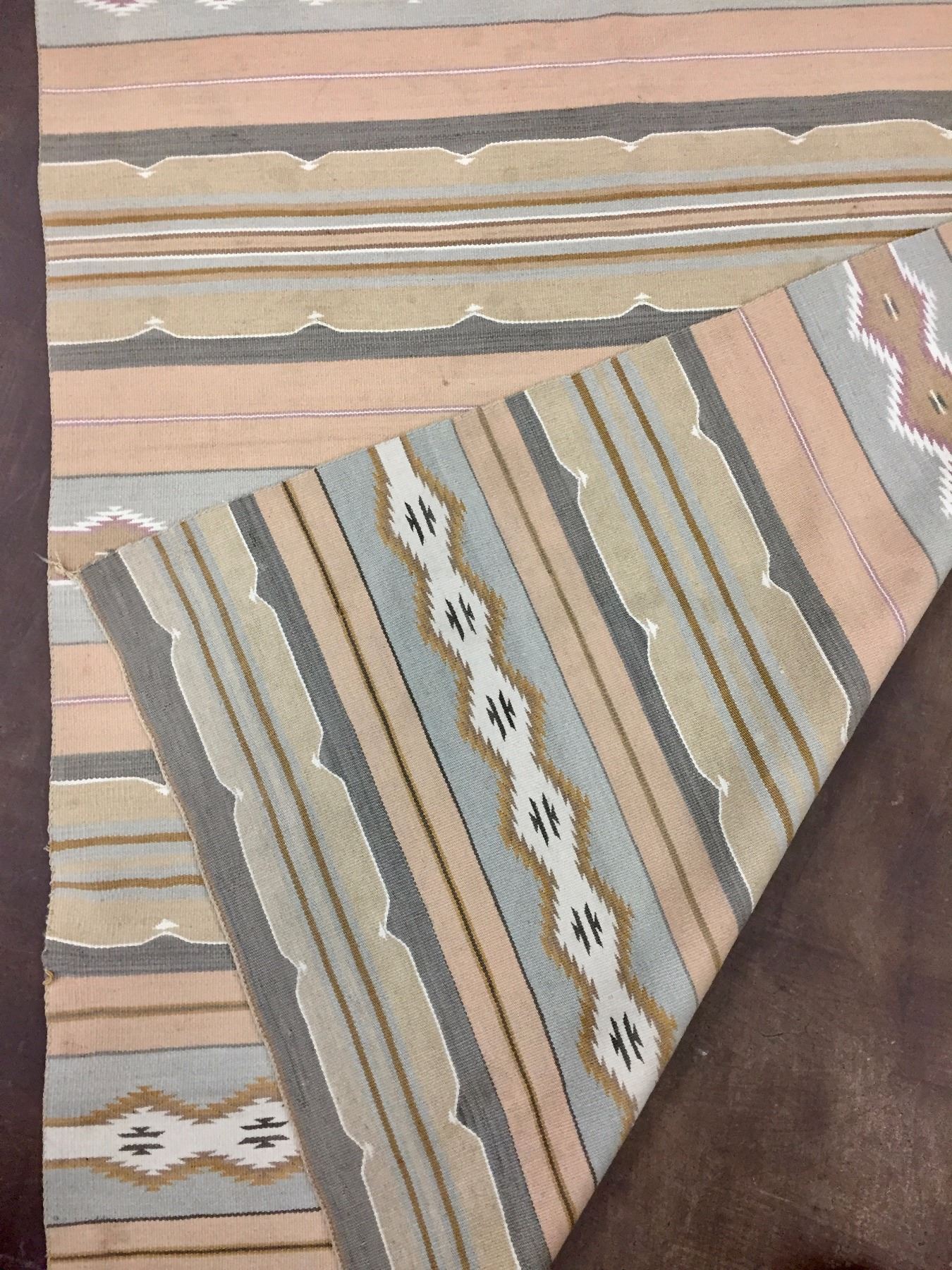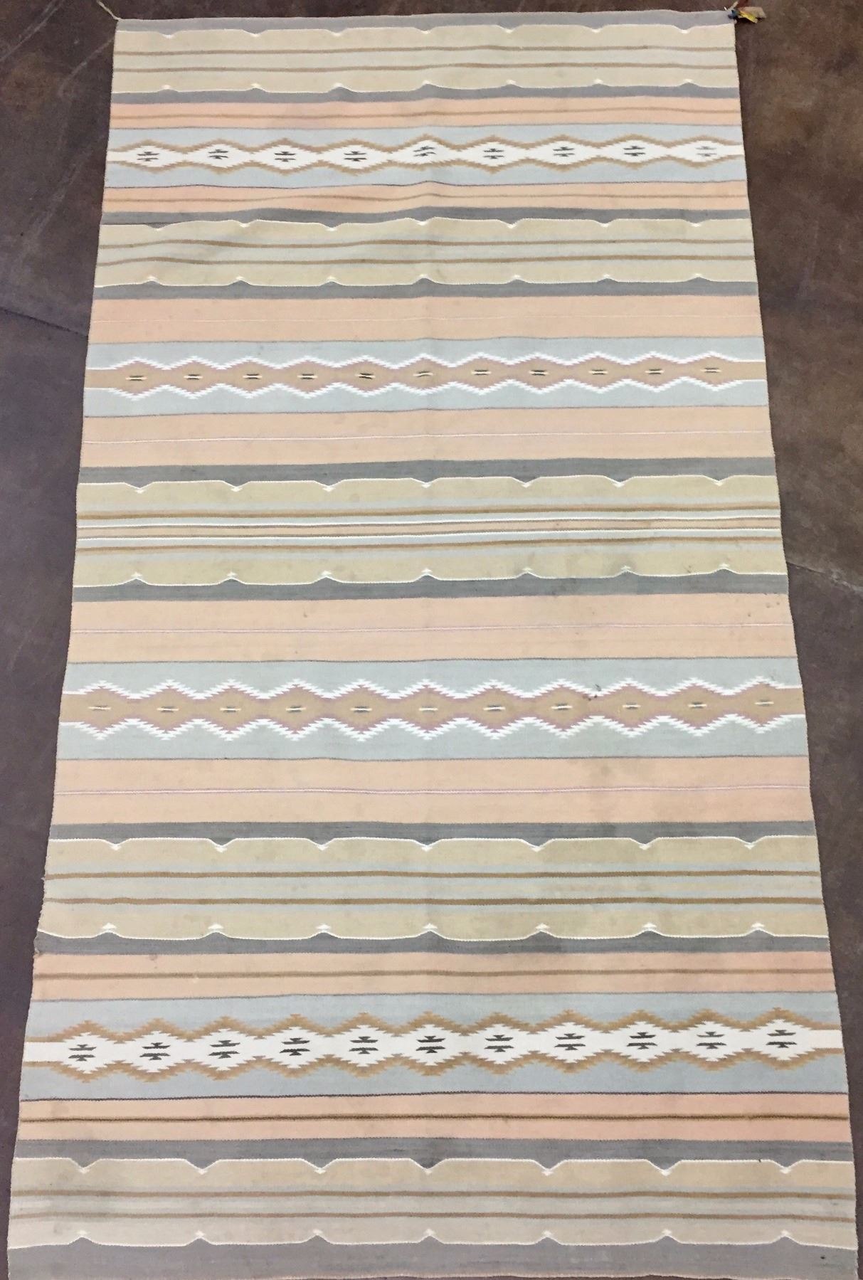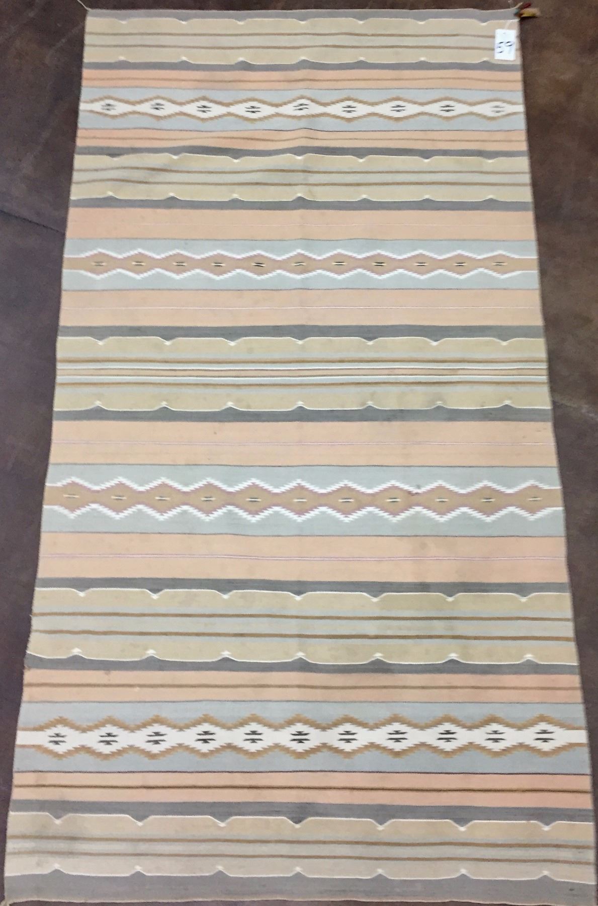 Maker: Unknown Navajo Weaver. Approx. Age: Circa 1940s. Size: 47” x 81”. Additional Info: Crystal style. Condition: Fairly good for its age, has some fading. Please look closely at the pictures - they are an important part of our description. Shipping: There will be a $5 handling / packaging fee for shipping this lot. The actual cost of postage will be added on top of that.