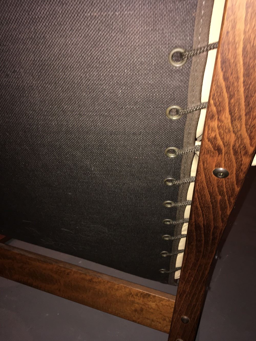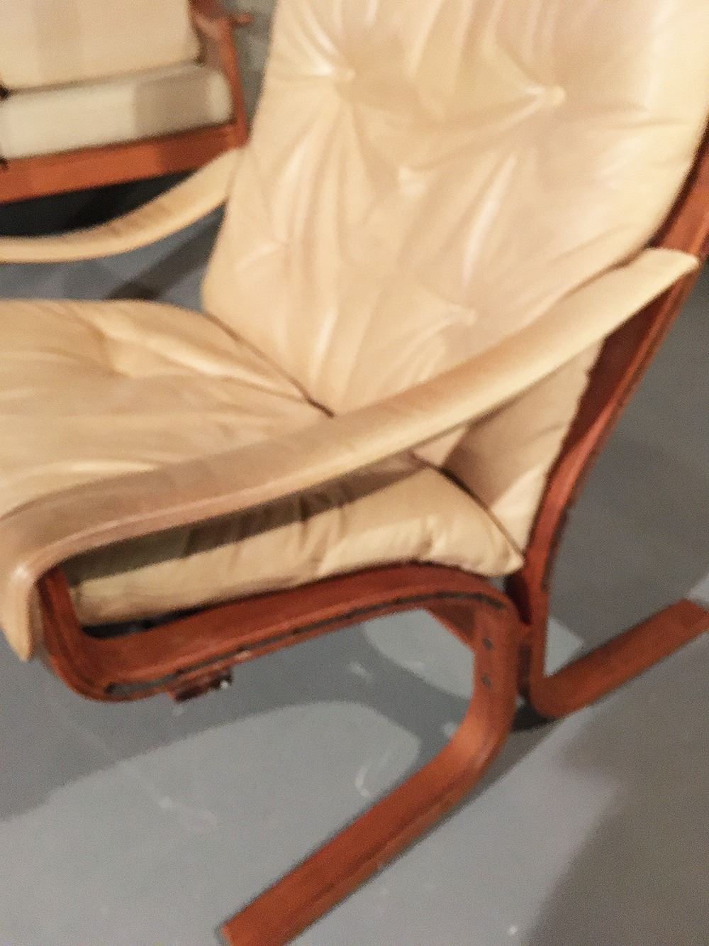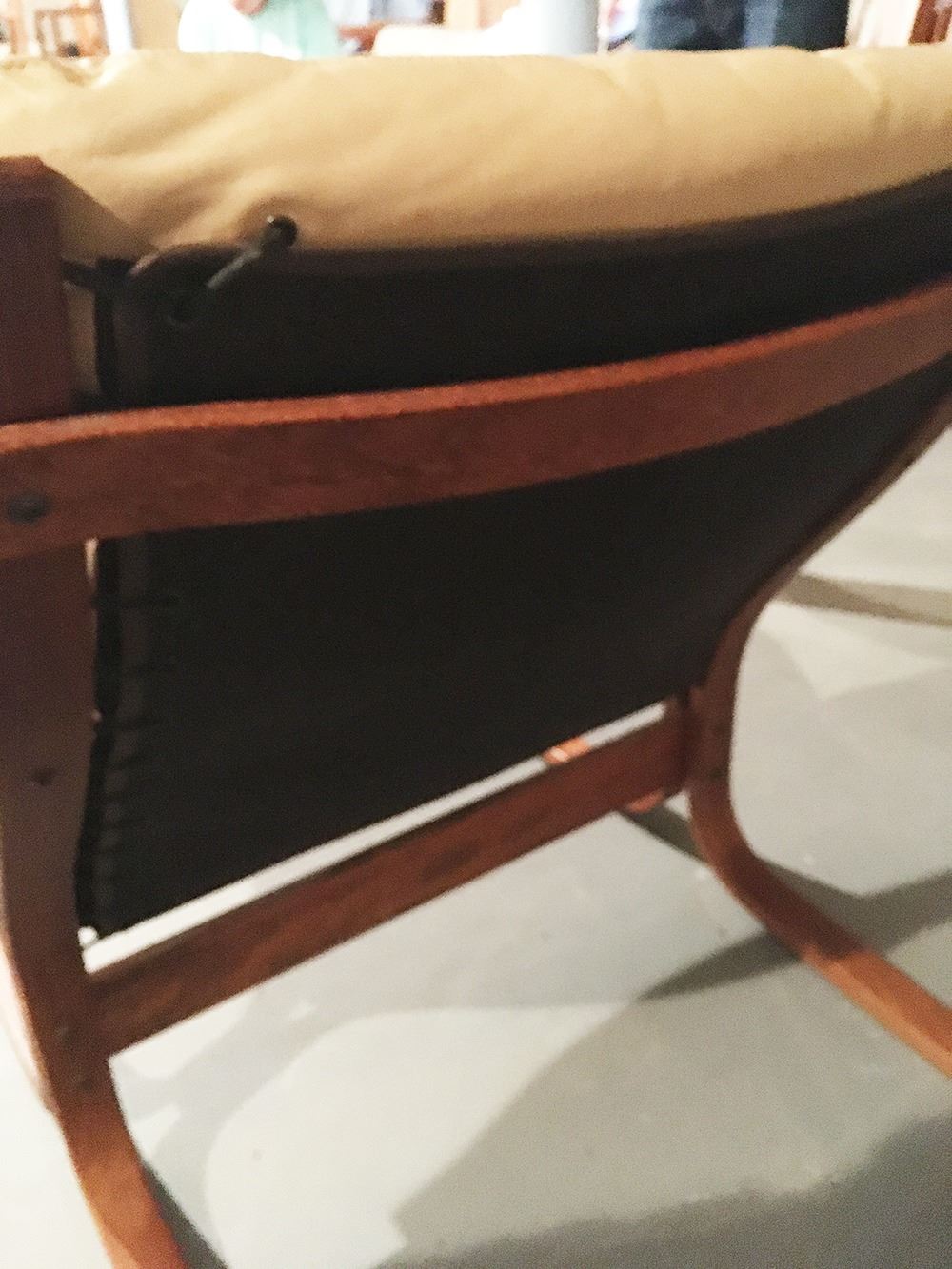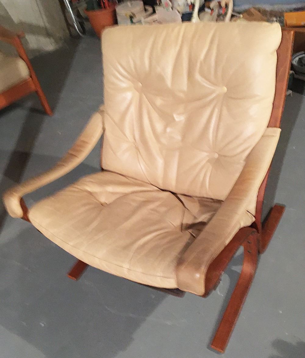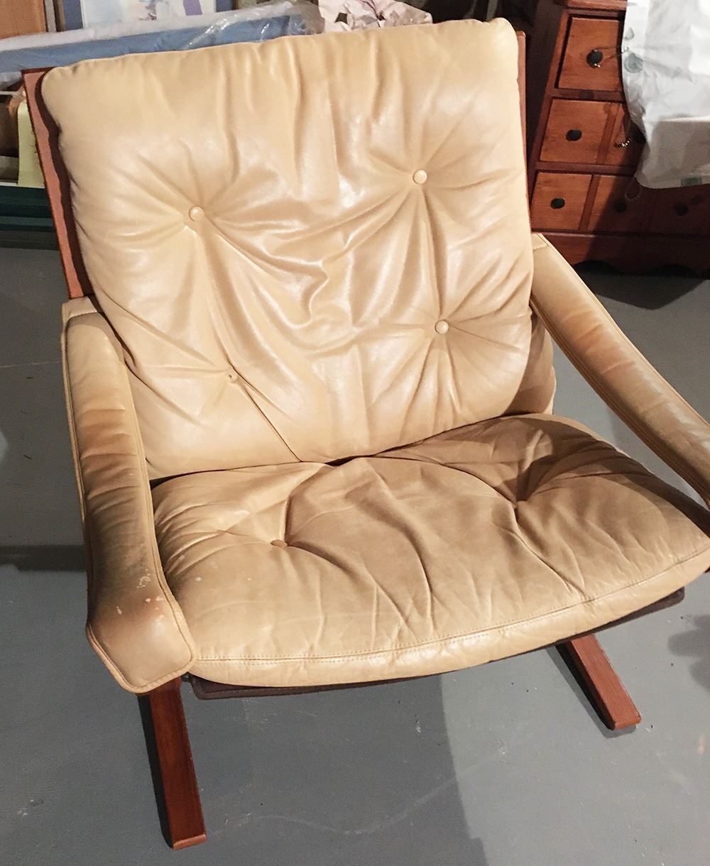 Mid-Century Danish leather chair, canvas back, maplewood teak stain, light leather, measures approx. 28.5 inches x 28.5 inches x 32 inches.