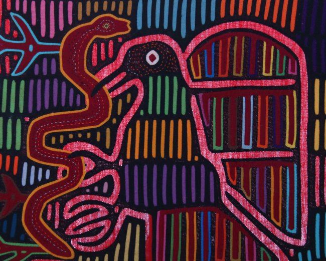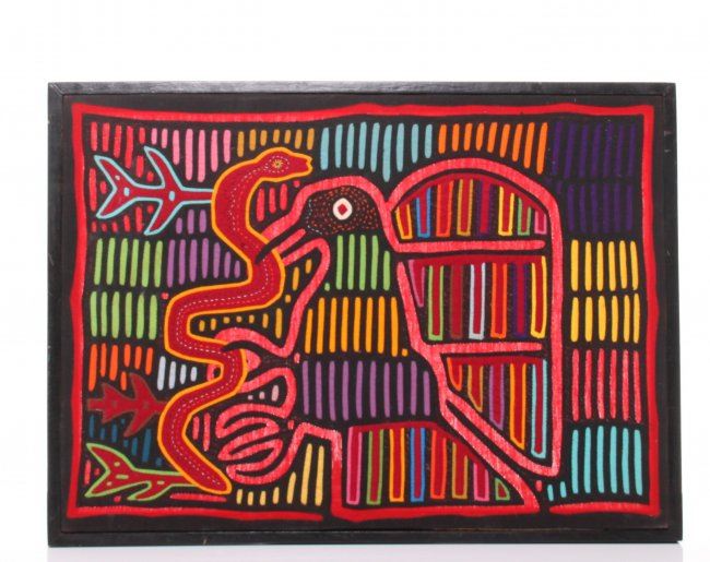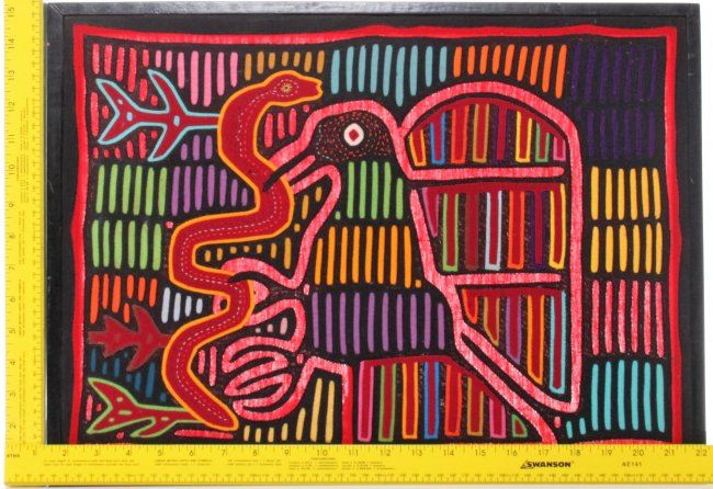 Mid Century "Eagle and Snake", a brilliant colored hand stitched Mola textile. The Mola forms part of the traditional outfit of a Kuna woman, two Mola panels being incorporated as front and back panels in a blouse. Molas have their origin in body painting. Only after colonization by the Spanish and contact with missionaries did the Kuna start to transfer their traditional geometric designs on fabric, first by painting directly on the fabric and later by using the technique of reverse application. It is not known for certain when this technique was first used. It is assumed that the oldest Molas are between 150 and 170 years old. SIZE: see attached ruler photo. Photos are part of the description representing the condition report and can be used for authentication prior to the sale date. Pangaea Auctions urges Bidder's to view all attached photos in detail.