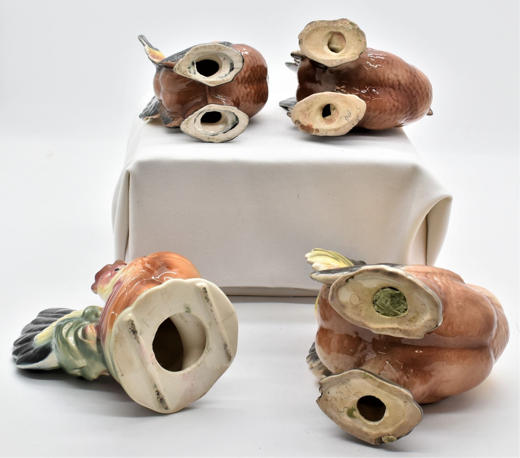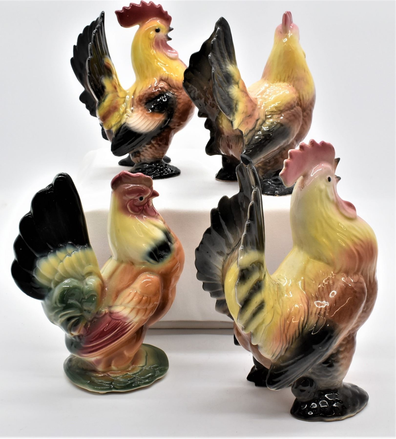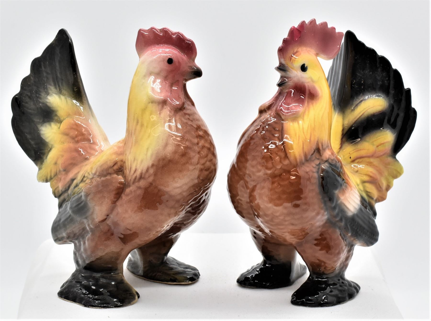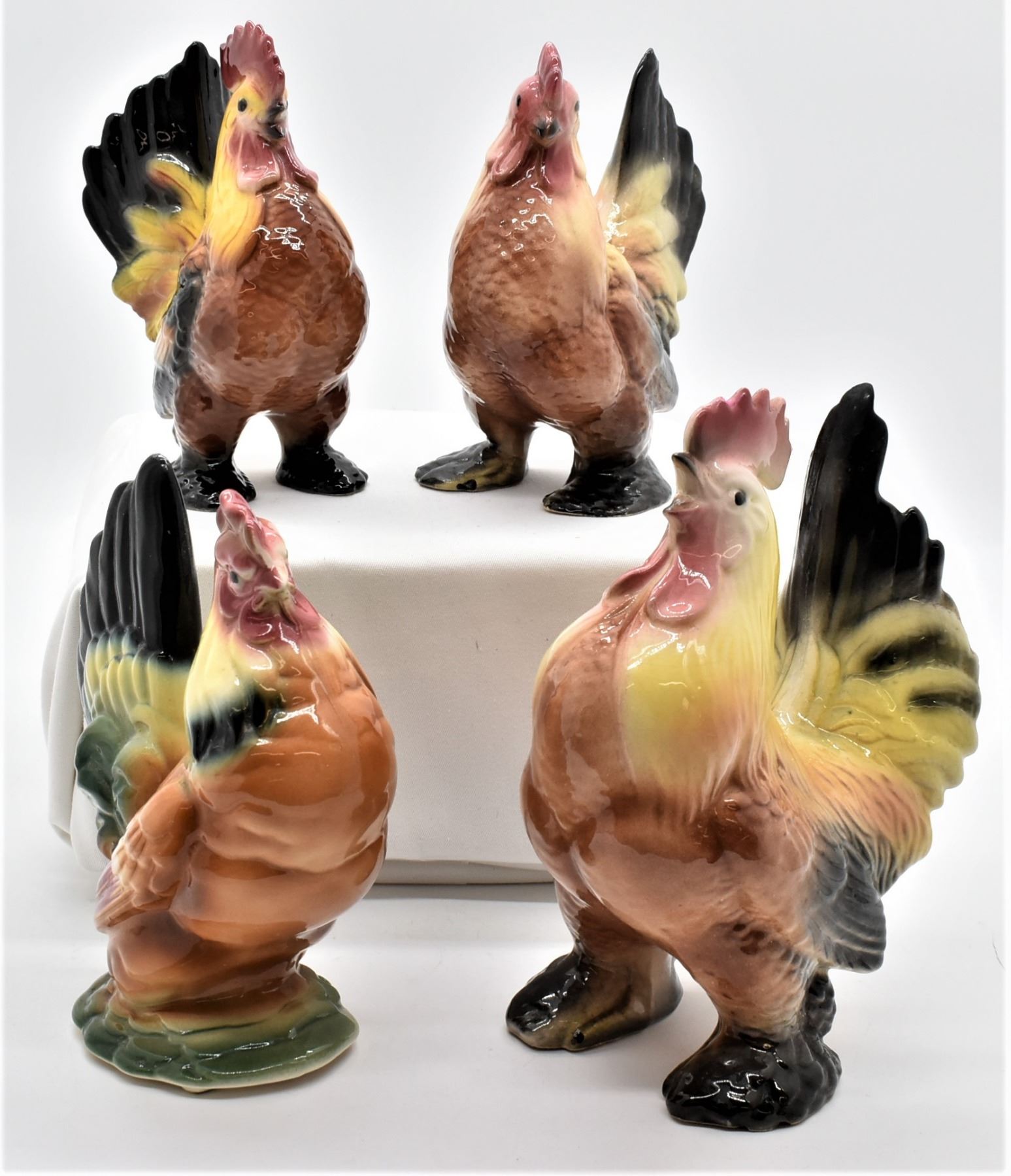 Mid Century Glazed Ceramic Pottery Chickens, largest measures 4.5''Deep x 8.75''H x 6.25''W, some minor chipping that has been camoflaged